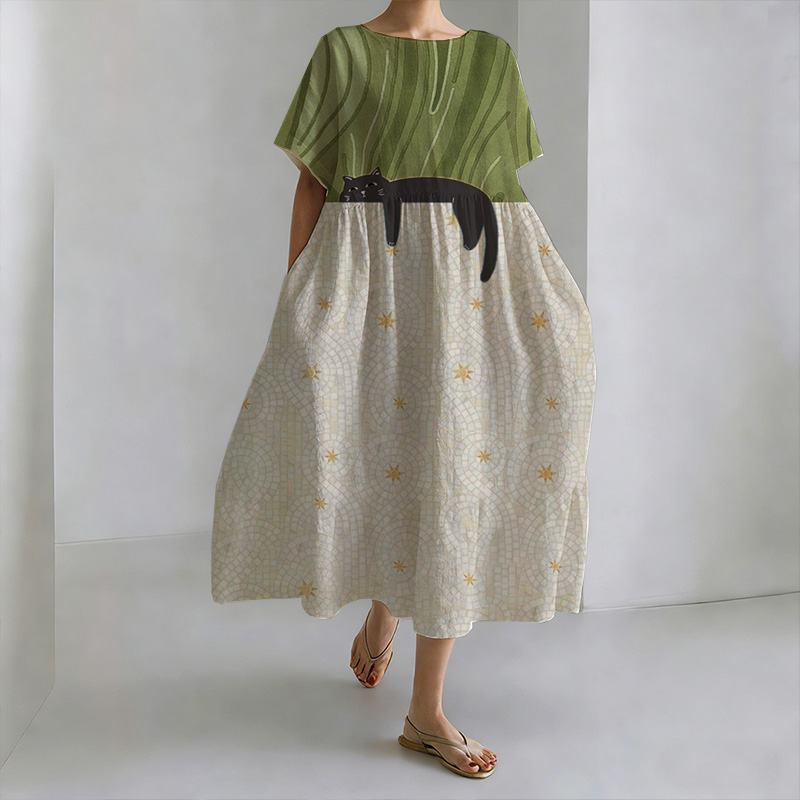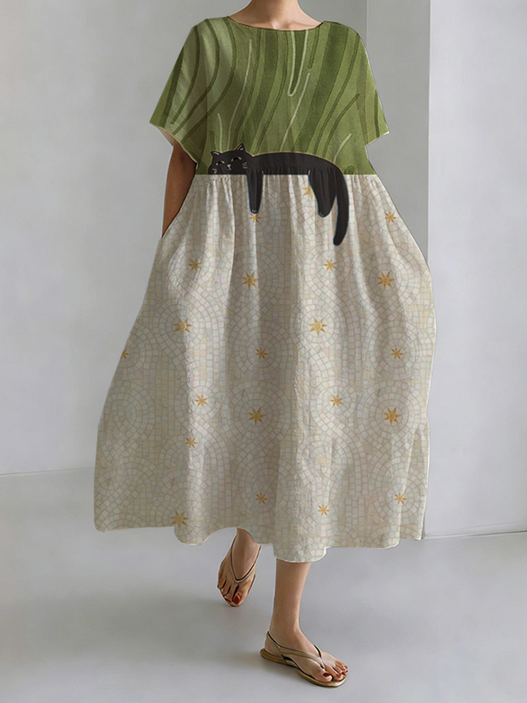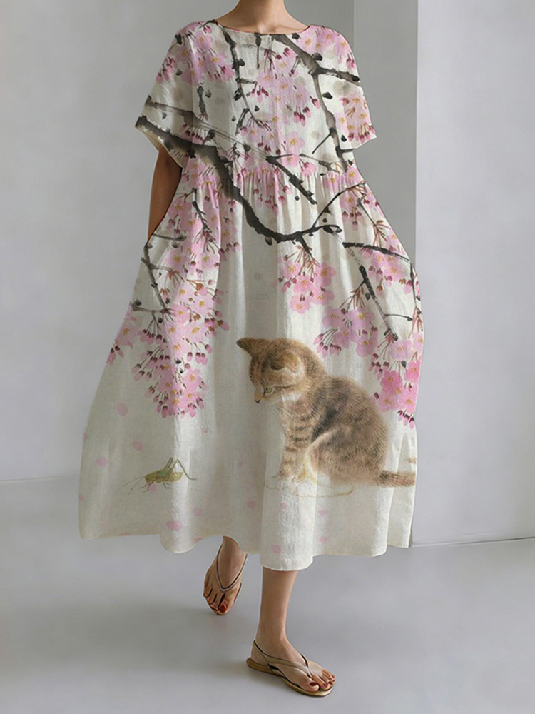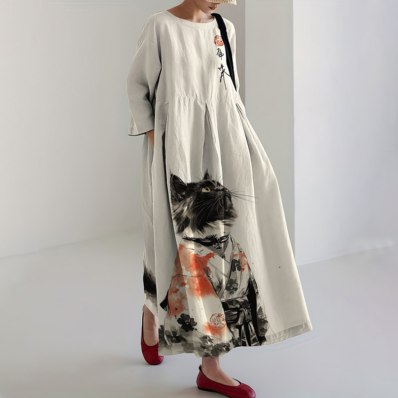 Japanese Style Cat Play Cotton And Linen Round Neck Dress