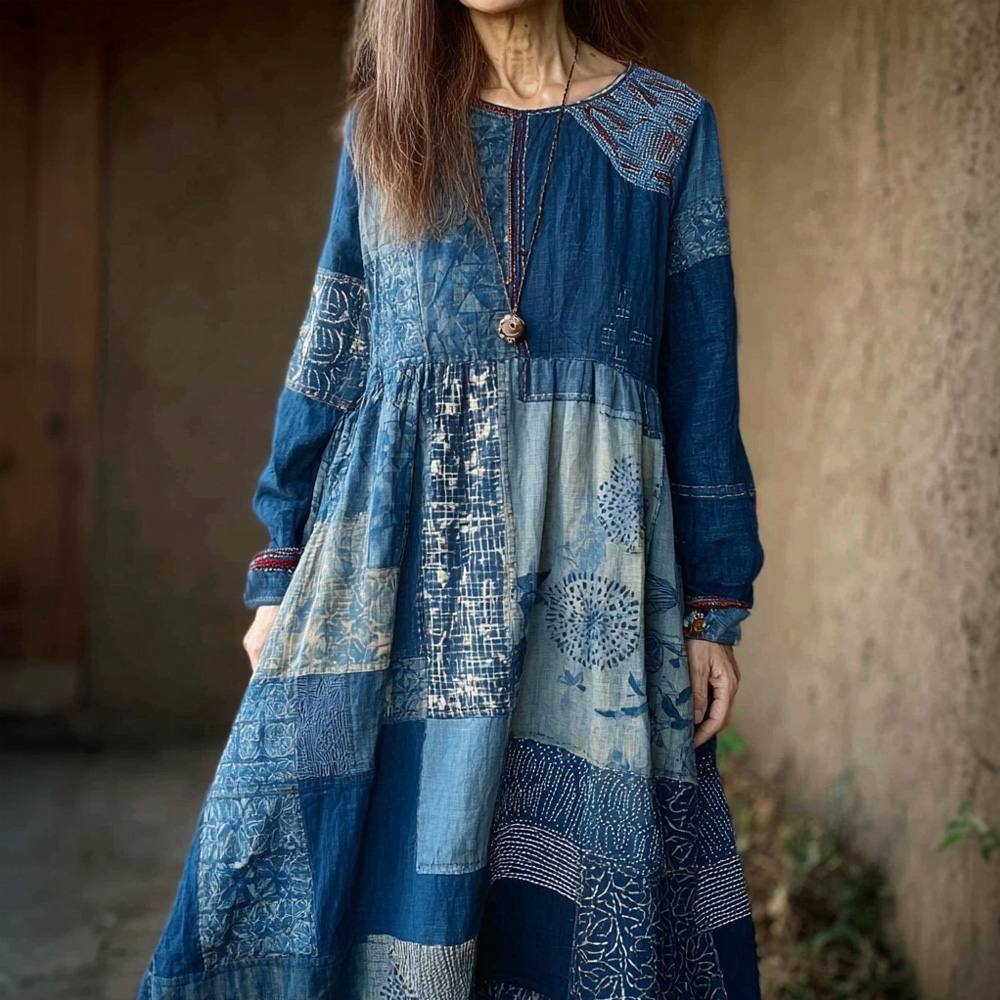 Women's Traditional Japanese Sashiko Art Round Neck Dress