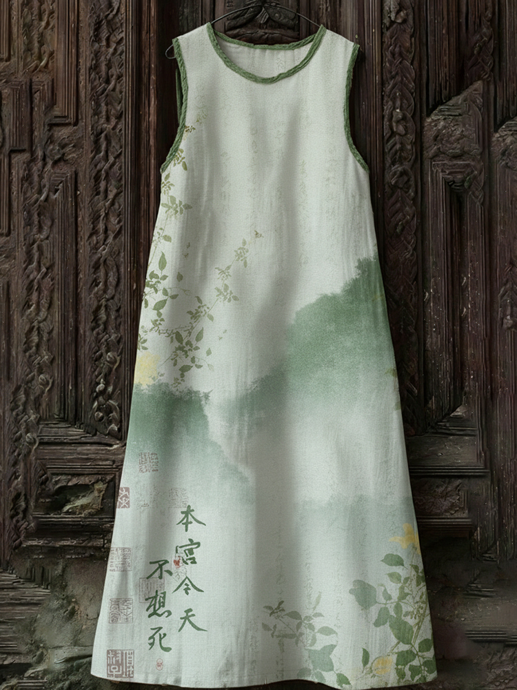 Women's Floral Art I Don't Want To Die Todayart Print Flowy Linen Blend Casual Sleeveless Midi Dress