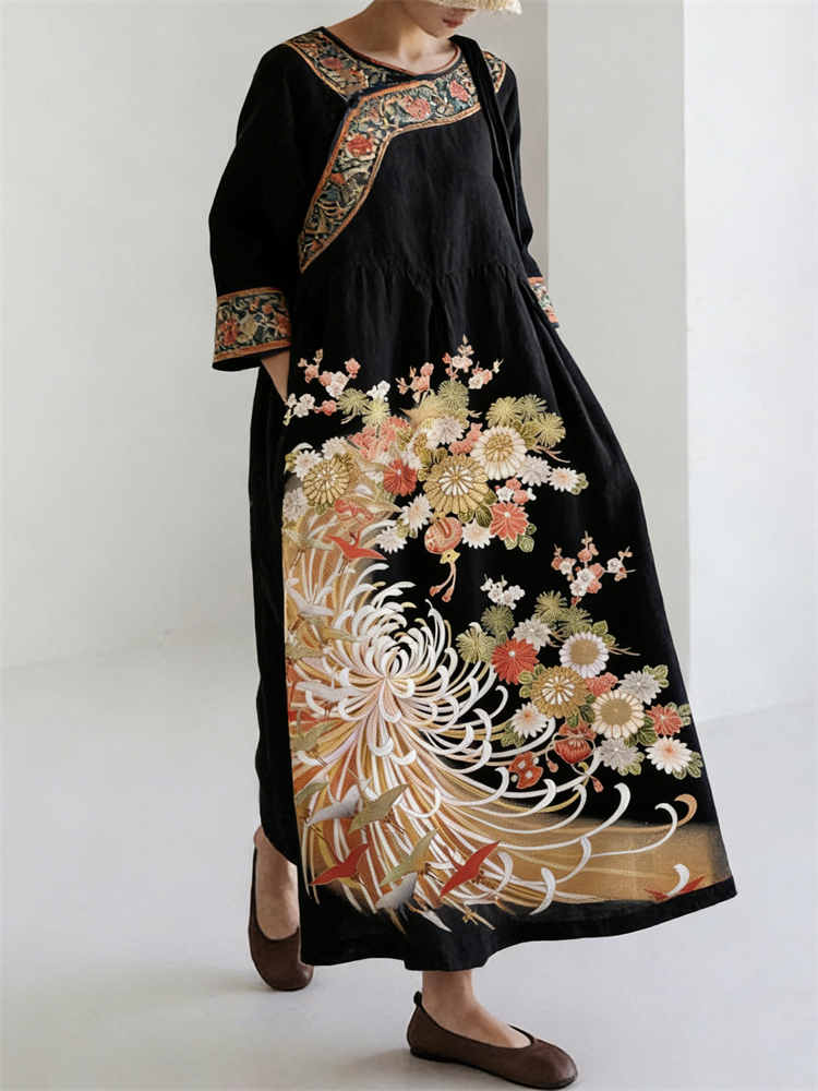 Japanese Chrysanthemum Floral Art Ethnic Linen Maxi Dress