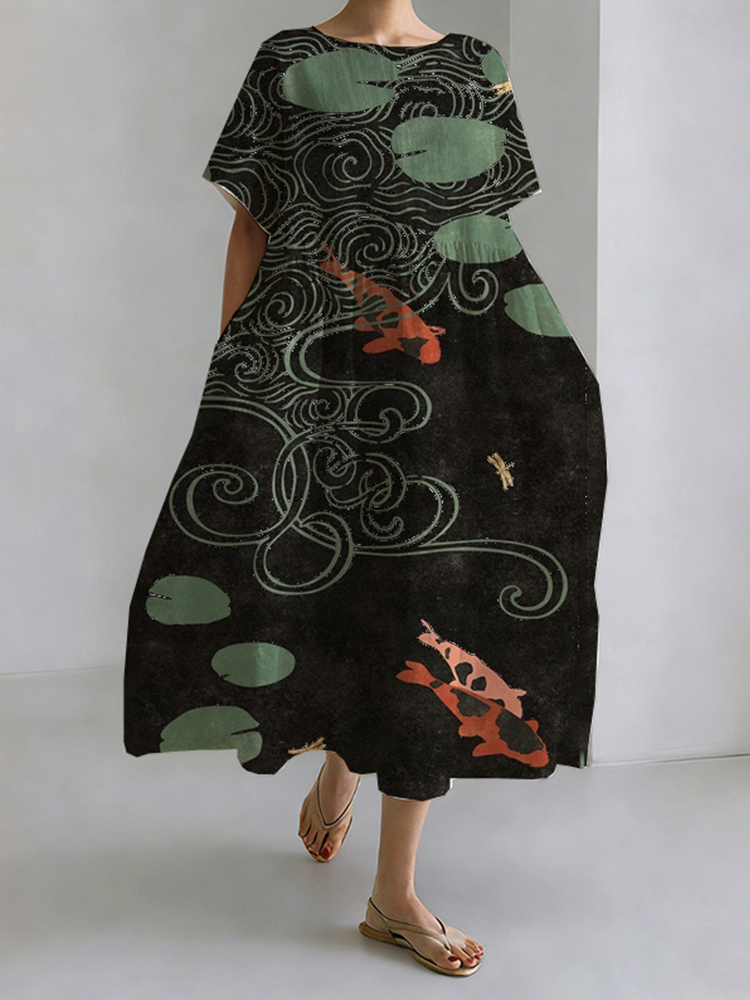 Japanese Style Koi And Lotus Pond Round Neck Casual Dress