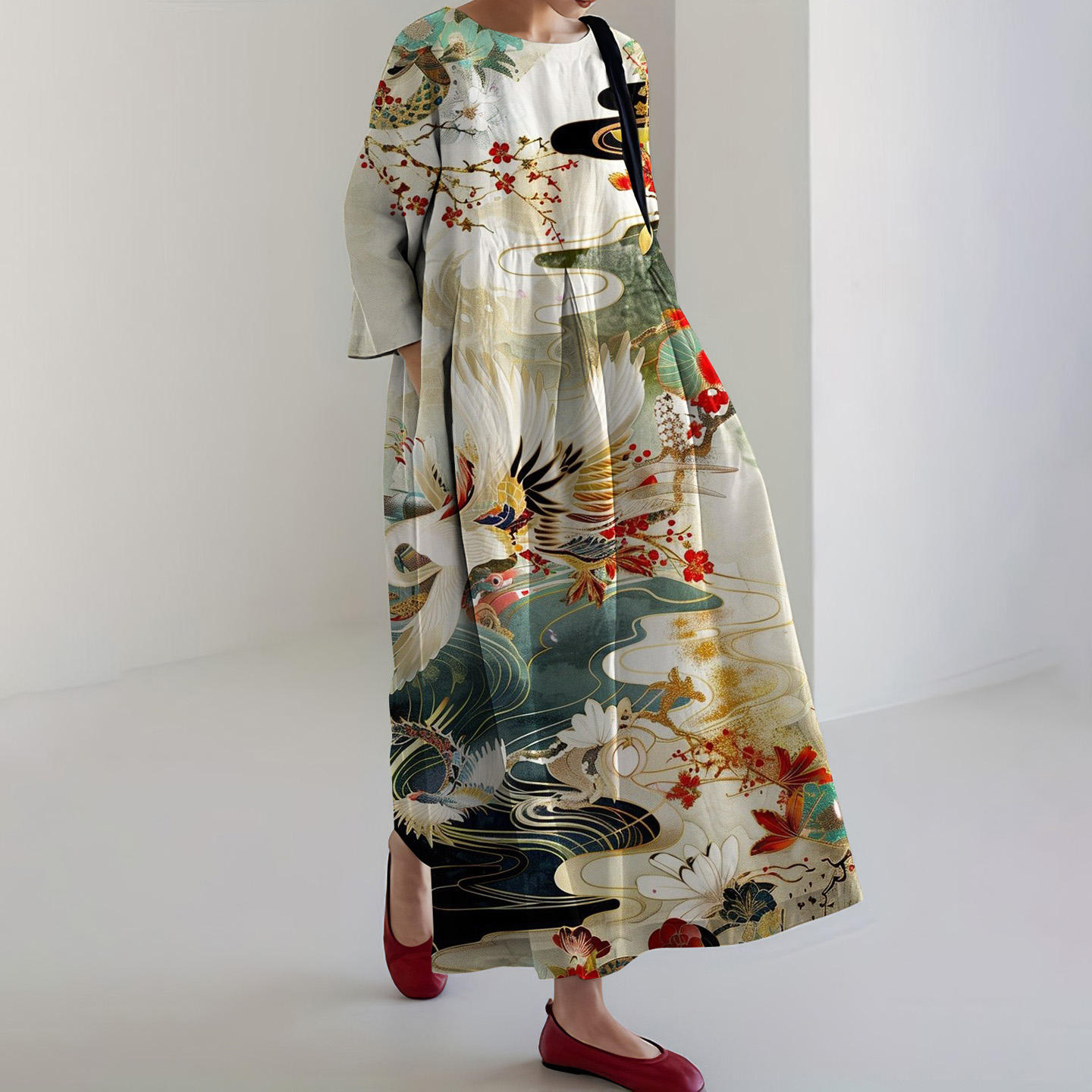 Women's Japanese Art Floral Painting Midi Dress