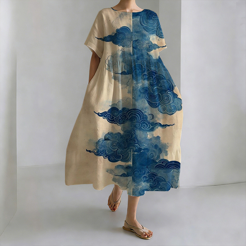 Japanese Retro Cloud Print Cotton Linen Round Neck Dress