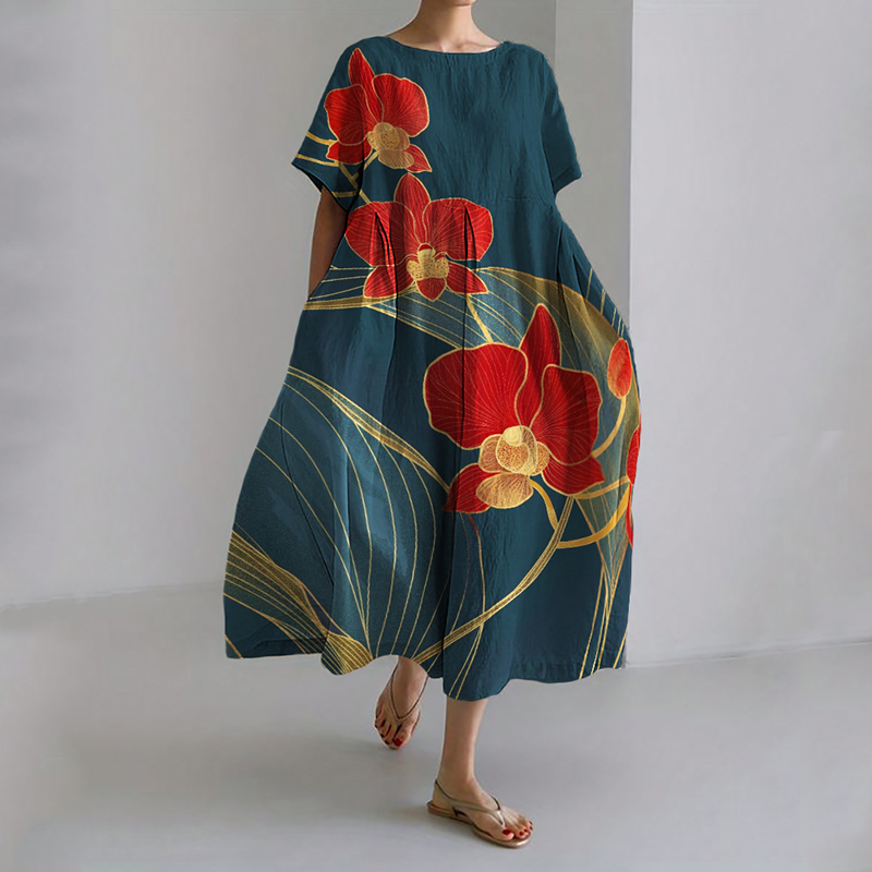 Red Orchids Japanese Art Linen Blend Maxi Dress