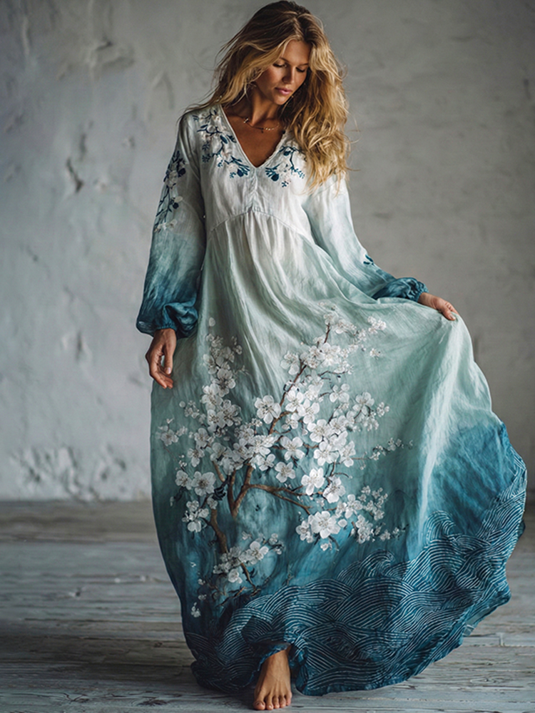 Blue Sakura Art Linen Blend Comfy Maxi Dress