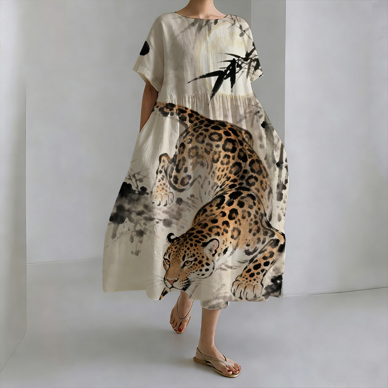Lotus Pond Tiger Print Round Neck Casual Dress