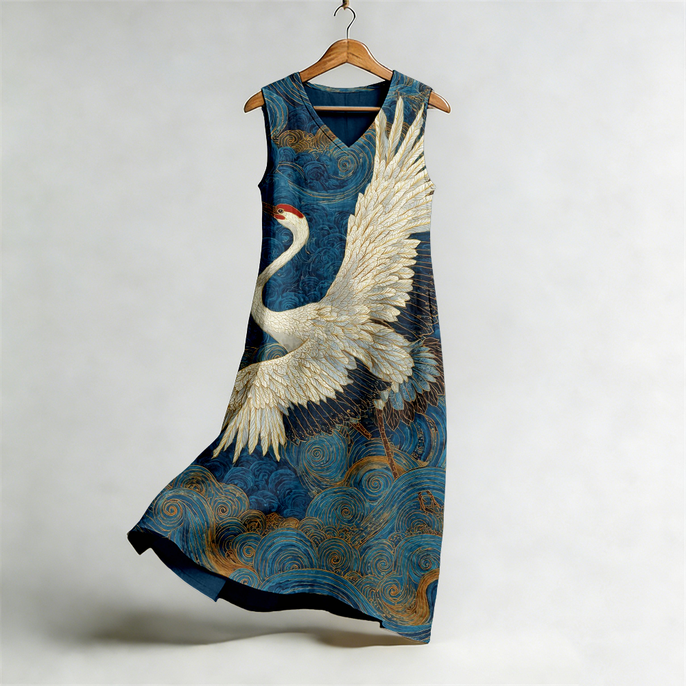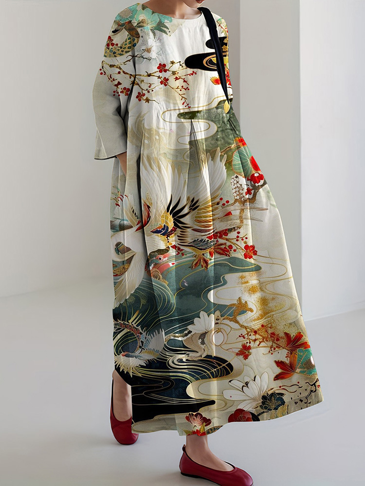 Vintage Japanese Cranes Art Flowy Linen Midi Dress