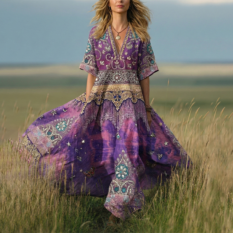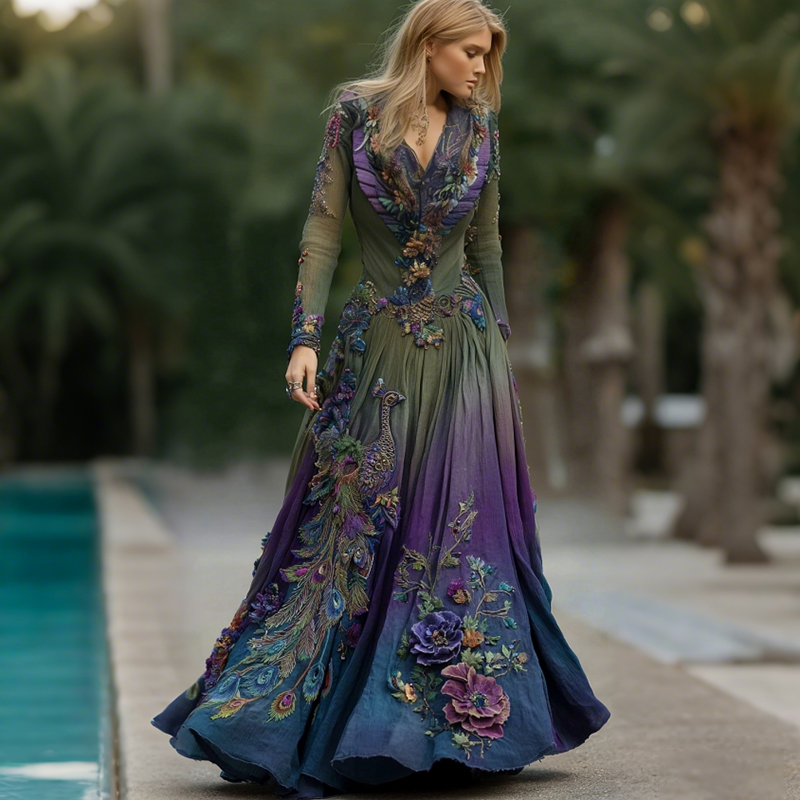 Vintage Classy Gradient Purple Peacock And Floral Embroidered V Neck Maxi Dress