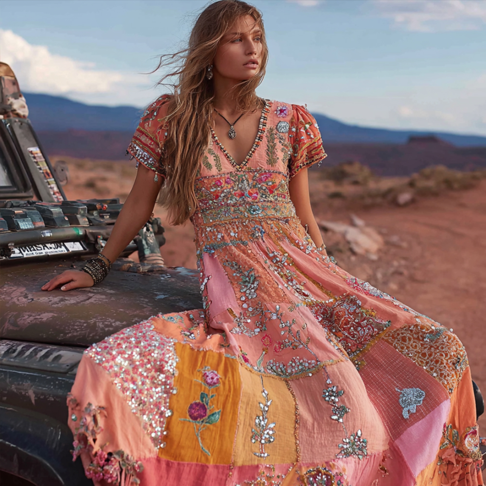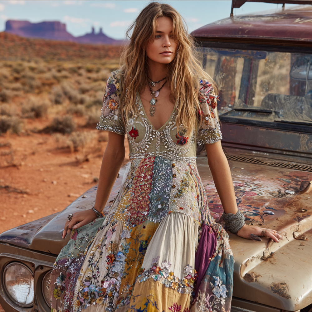 Women's Bohemian Western Patchwork Floral V-neck Retro Dress