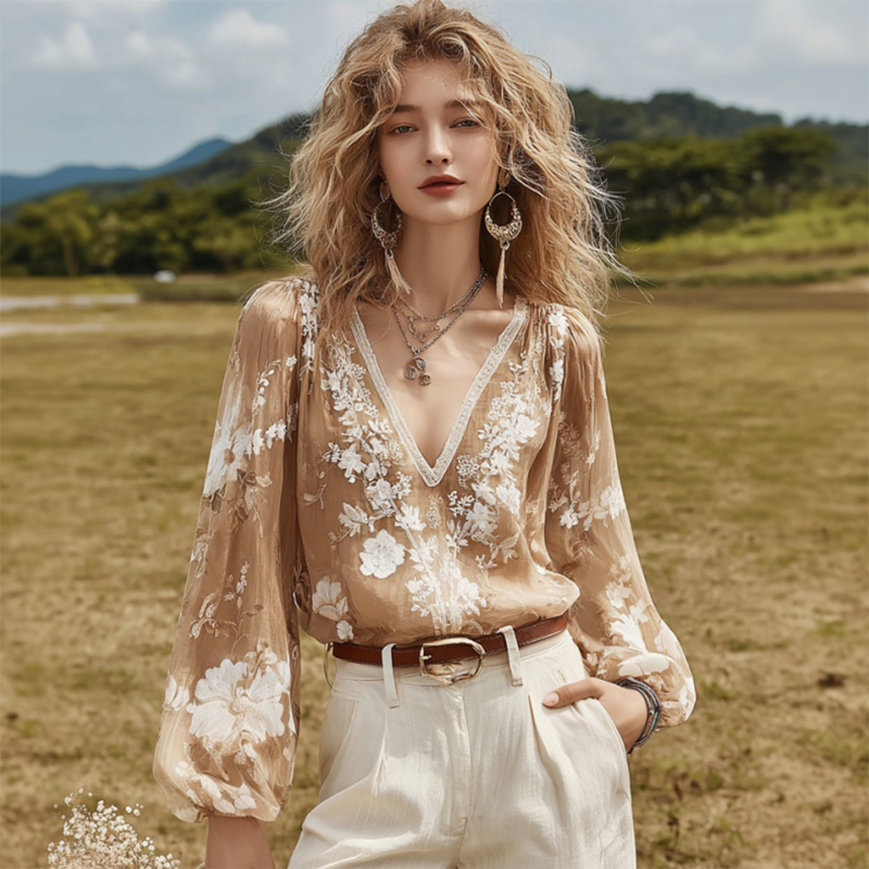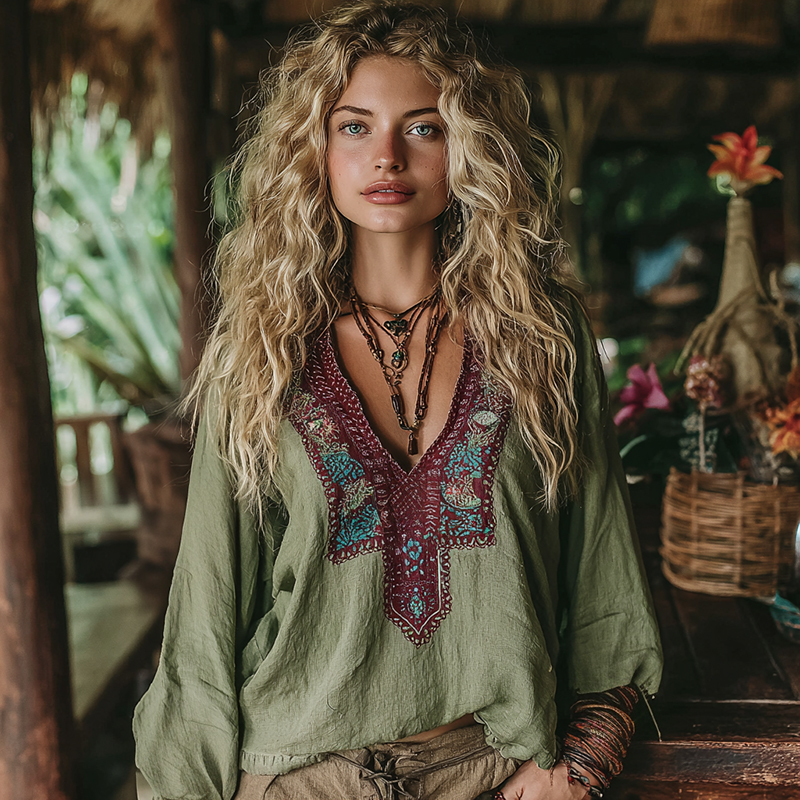 Women's Vintage Floral Embroidery Art V-neck Shirt
