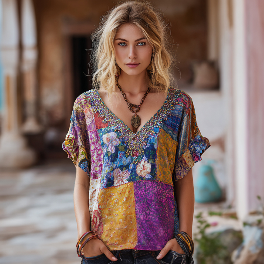 Vintage Bohemian Geometric Floral Patchwork Lightweight Short Sleeve Top