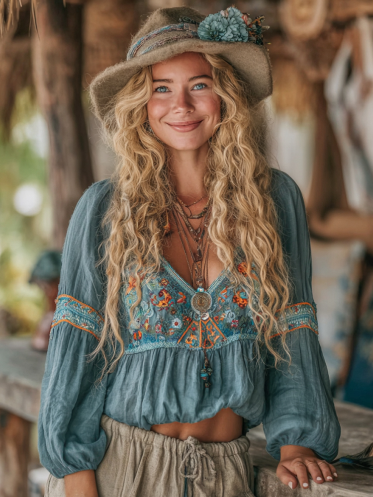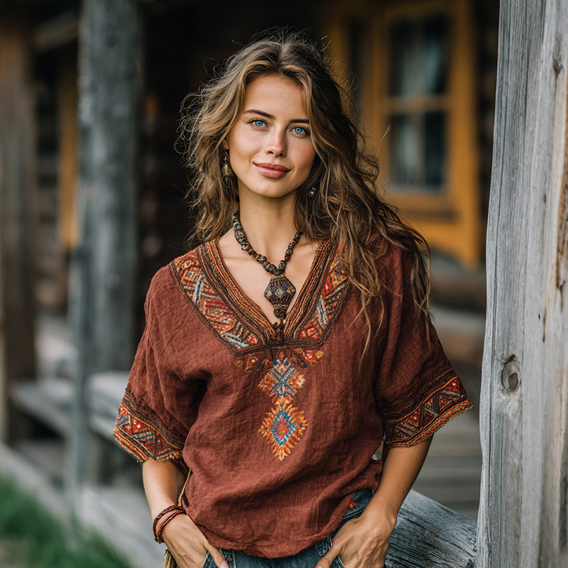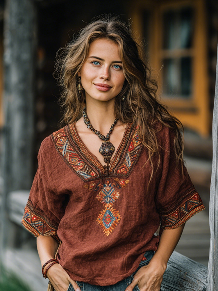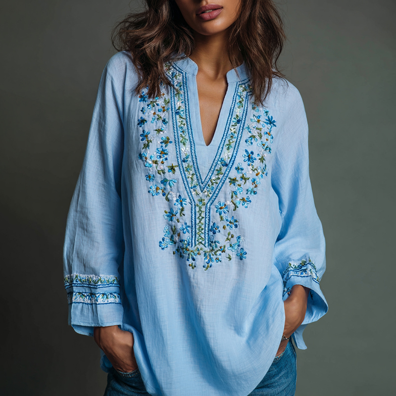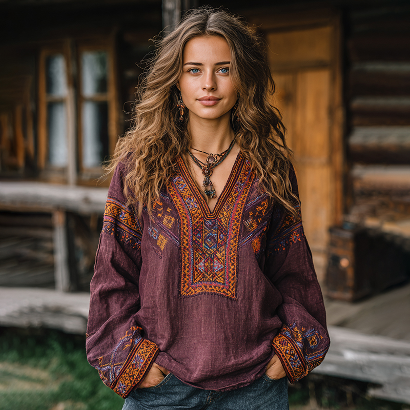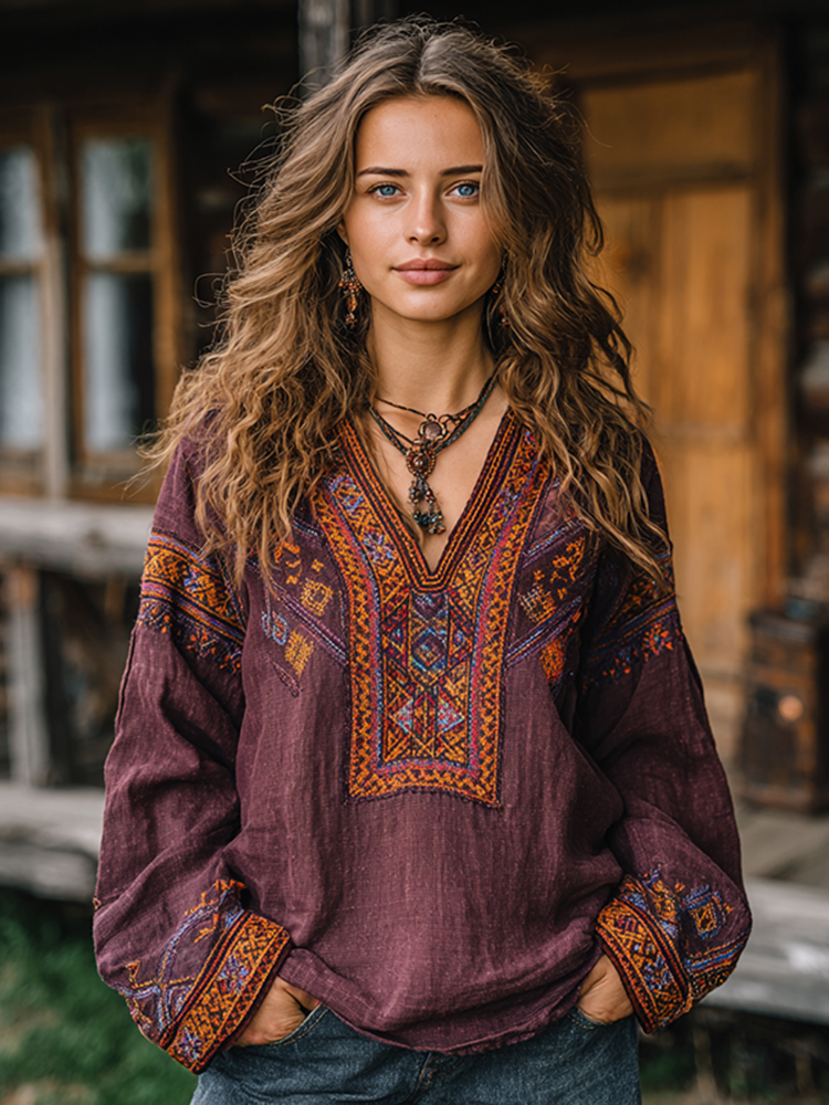 Women's Bohemian Rose Embroidered Linen V-neck Shirt