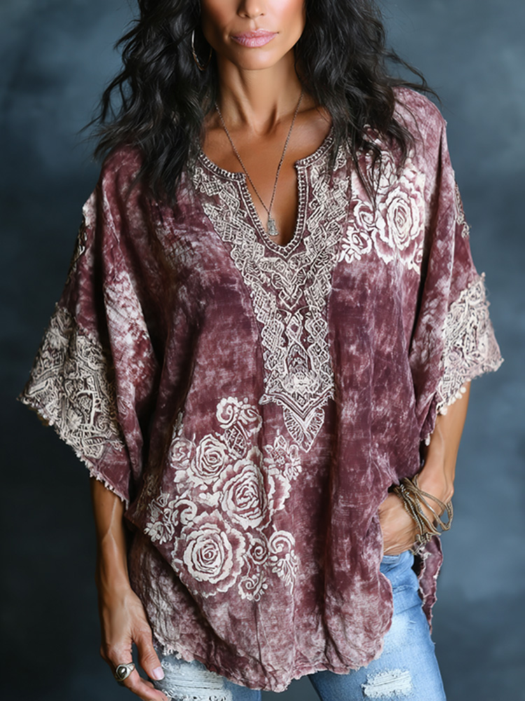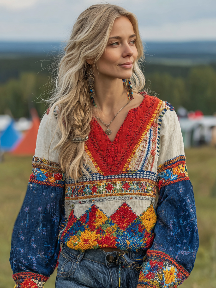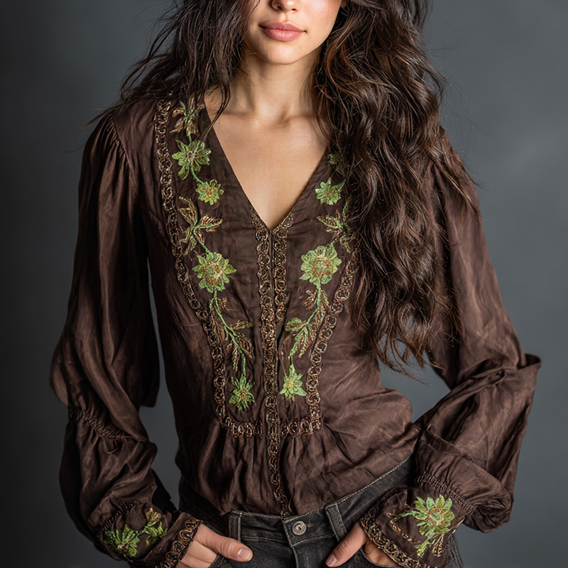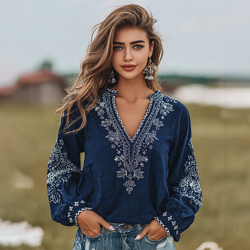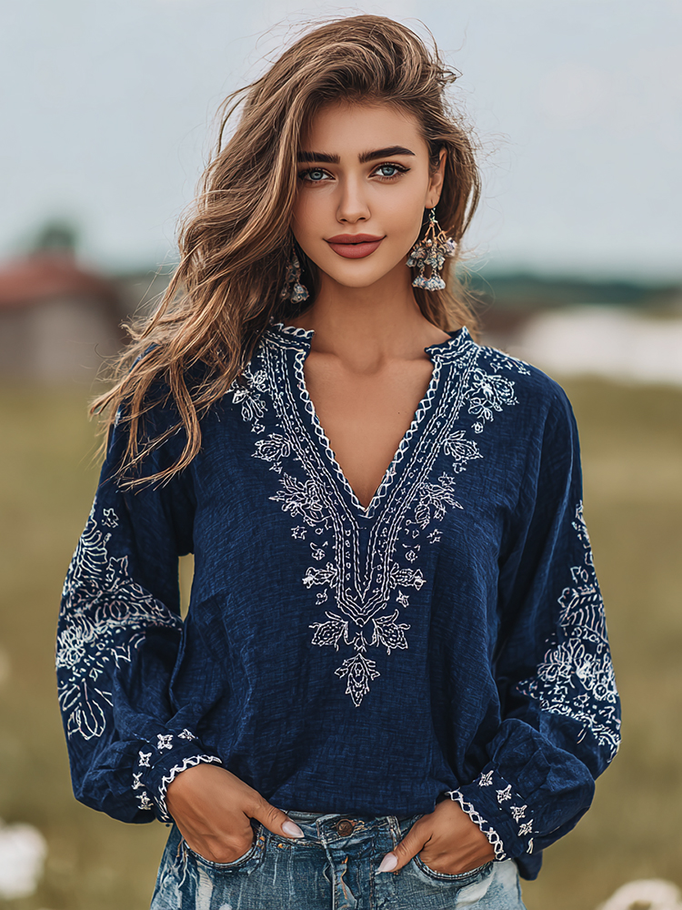 Women's Vintage Floral Embroidery Art V-neck Shirt