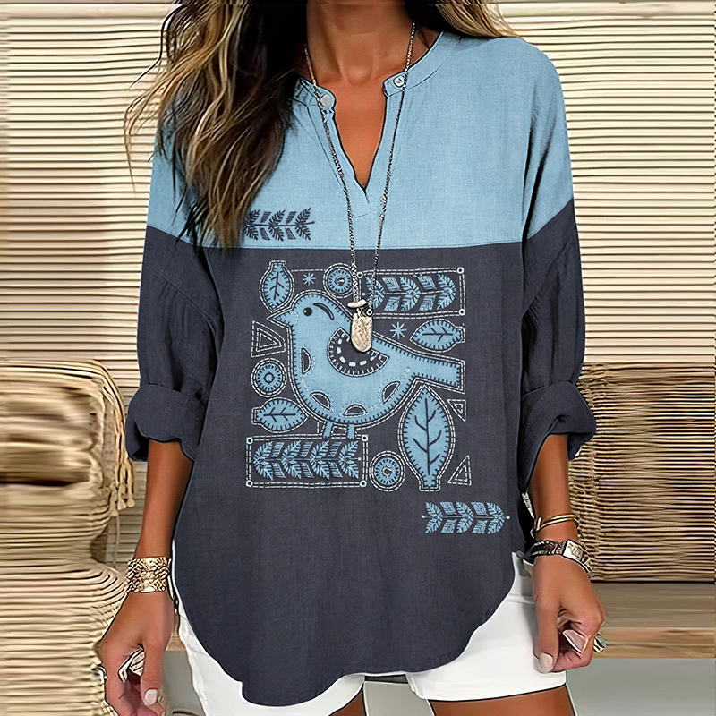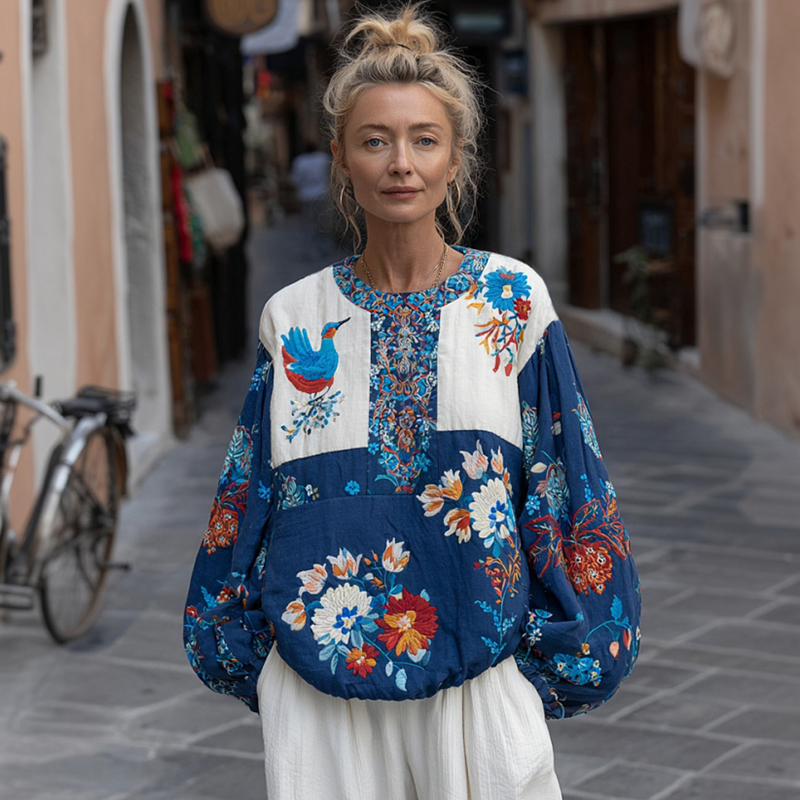 Women's Patchwork Art Floral And Bird Pattern Comfortable Top