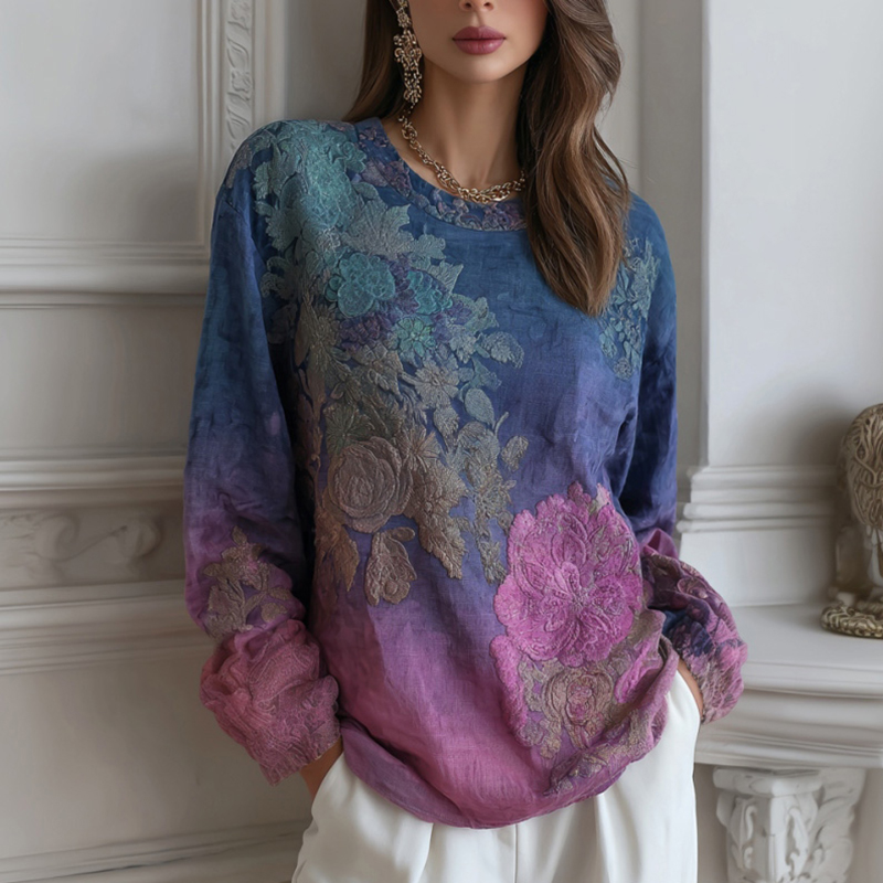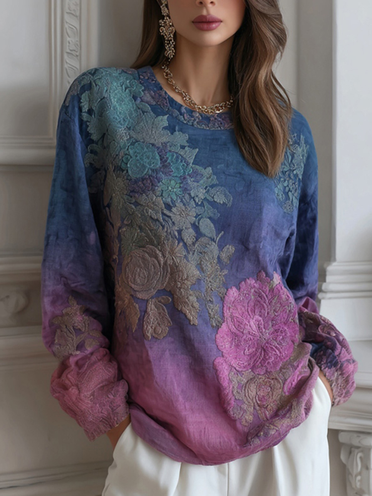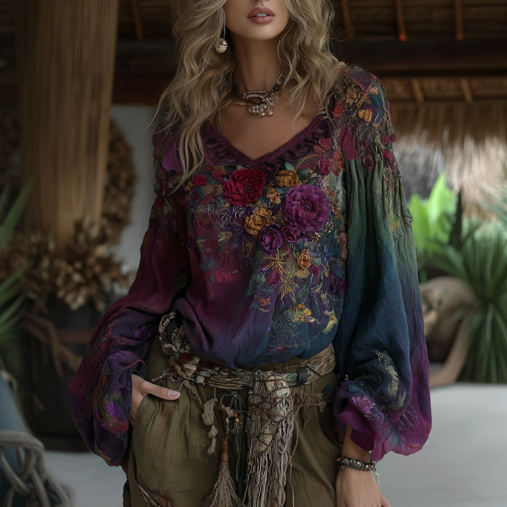 Boho Floral Embroidery Gradient Art Women's Linen Shirt