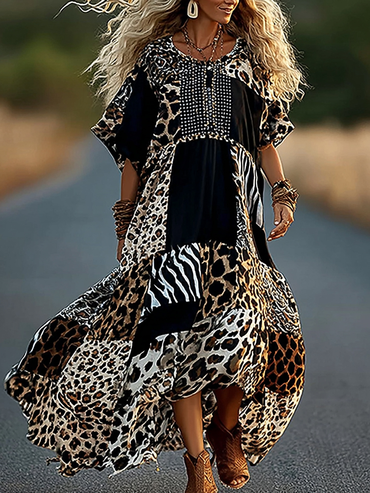 Retro Leopard And Animal Patchwork Art Loose Maxi Dress