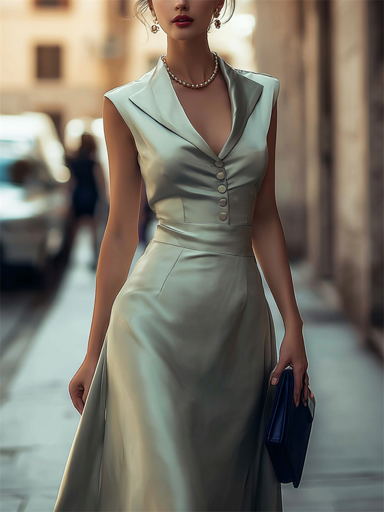 Vintage Lapels Button Up Flowy Satin Maxi Dress
