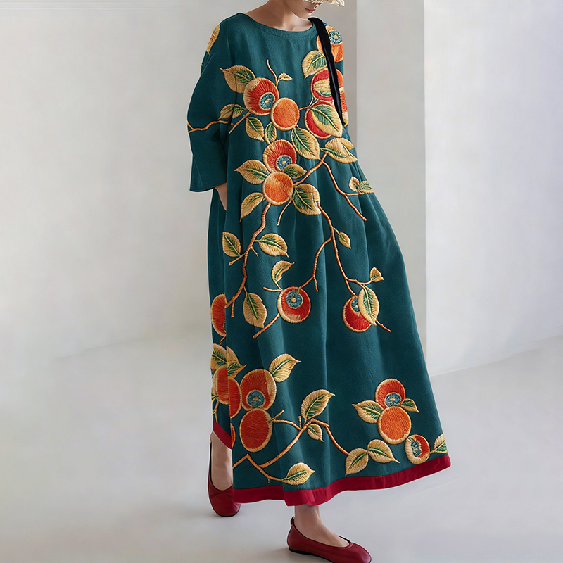 Women's Japanese Floral Print Round Neck Linen Blend Midi Dress
