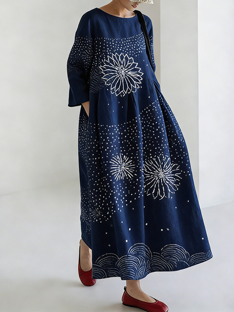 Women's Japanese Sashiko Embroidery Floral Pattern Dress