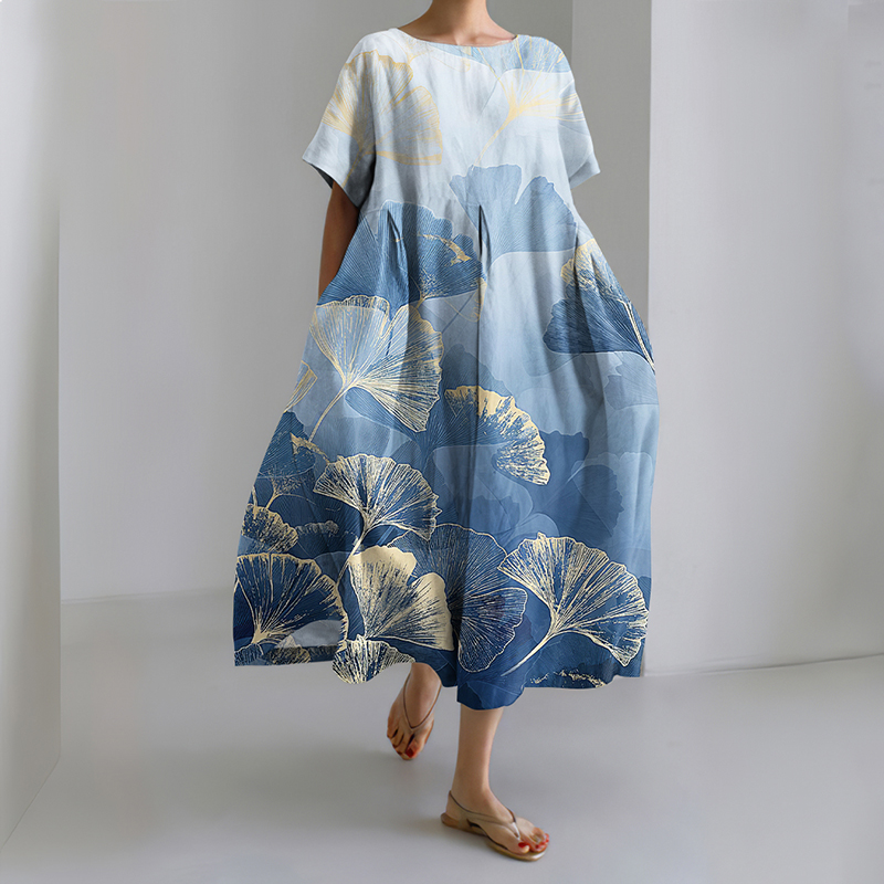 Women's Retro Plant Ginkgo Leaf Print Linen Dress