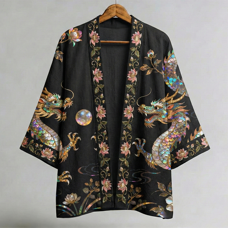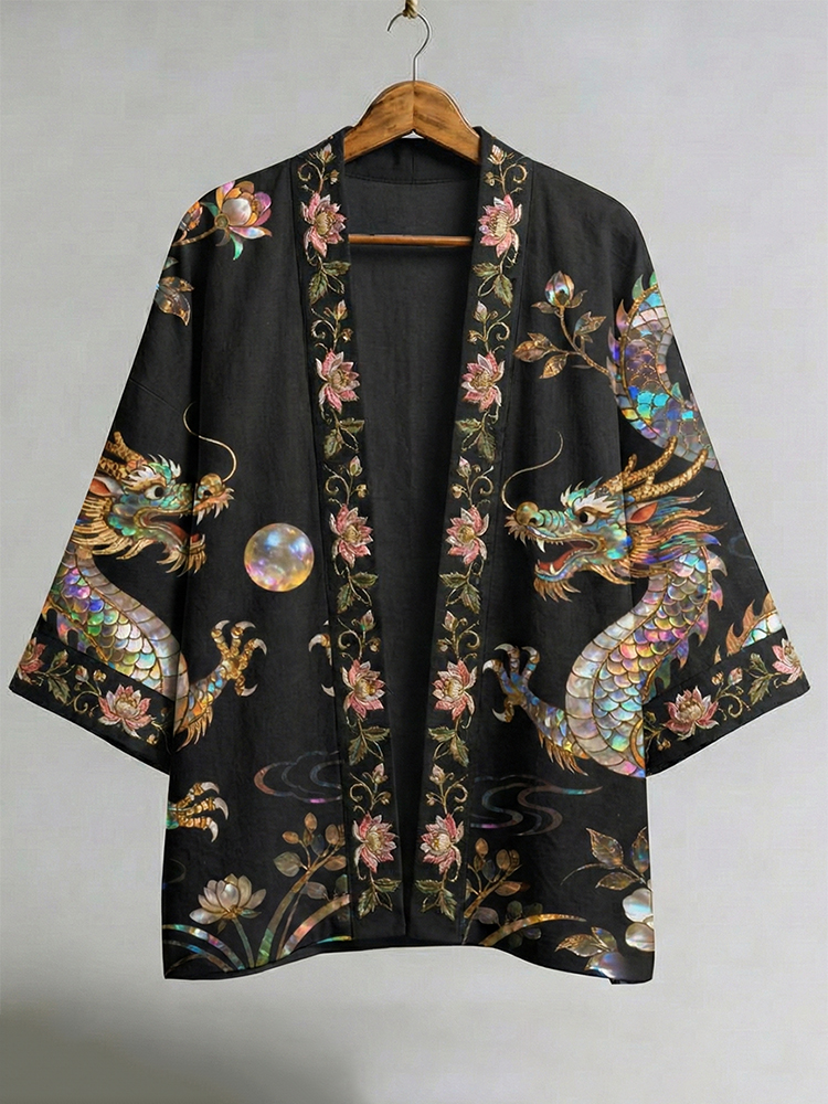 Japanese Dragon And Pearl Motif Art Linen Kimono