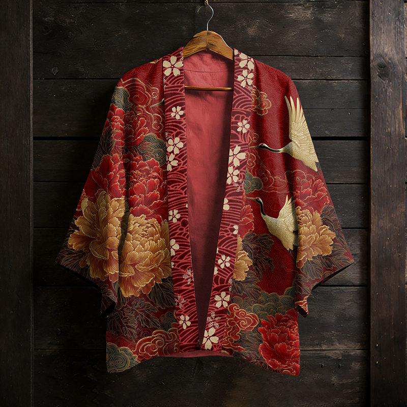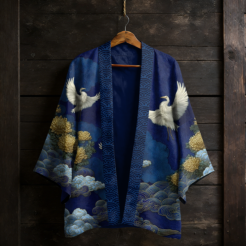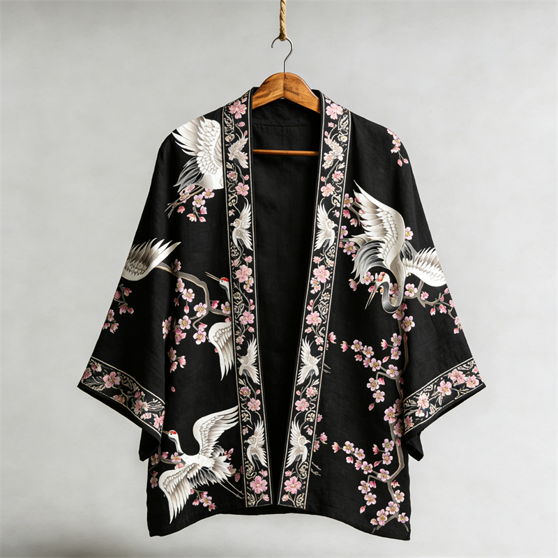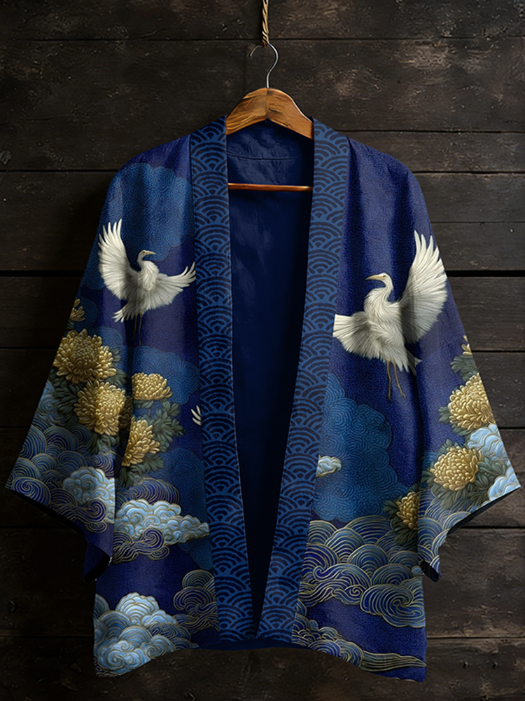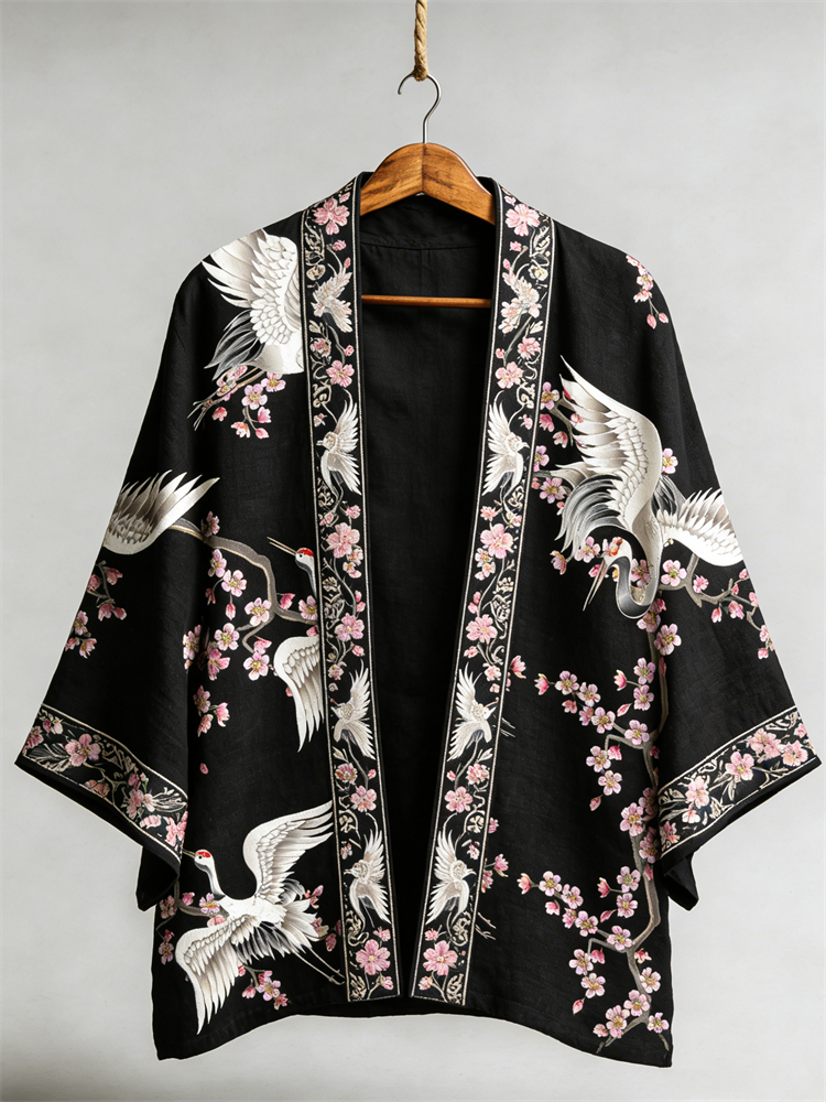Japanese Vintage Flower White Crane Pattern Casual Kimono Cardigan