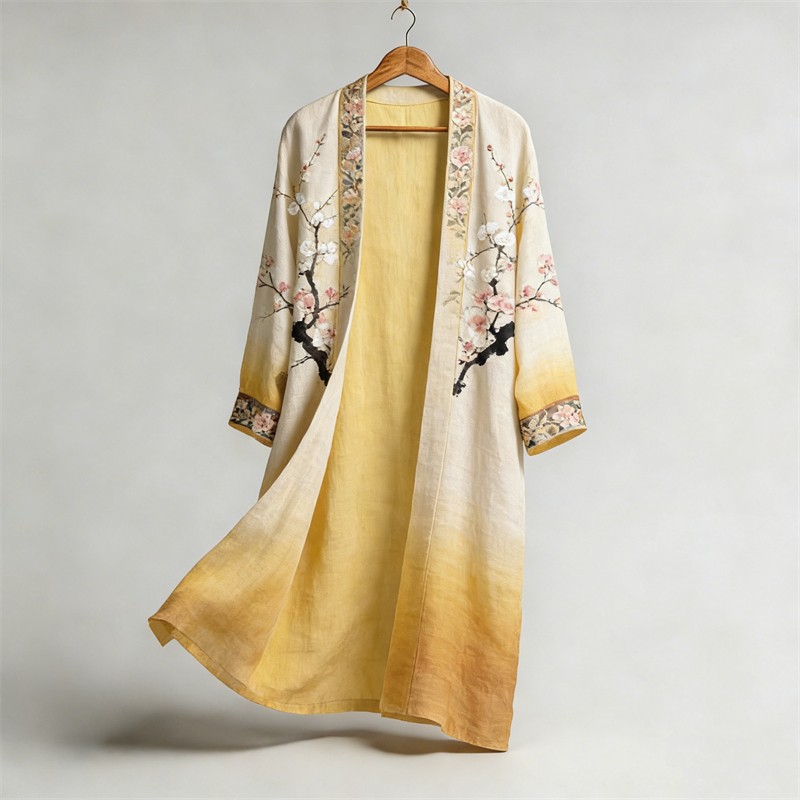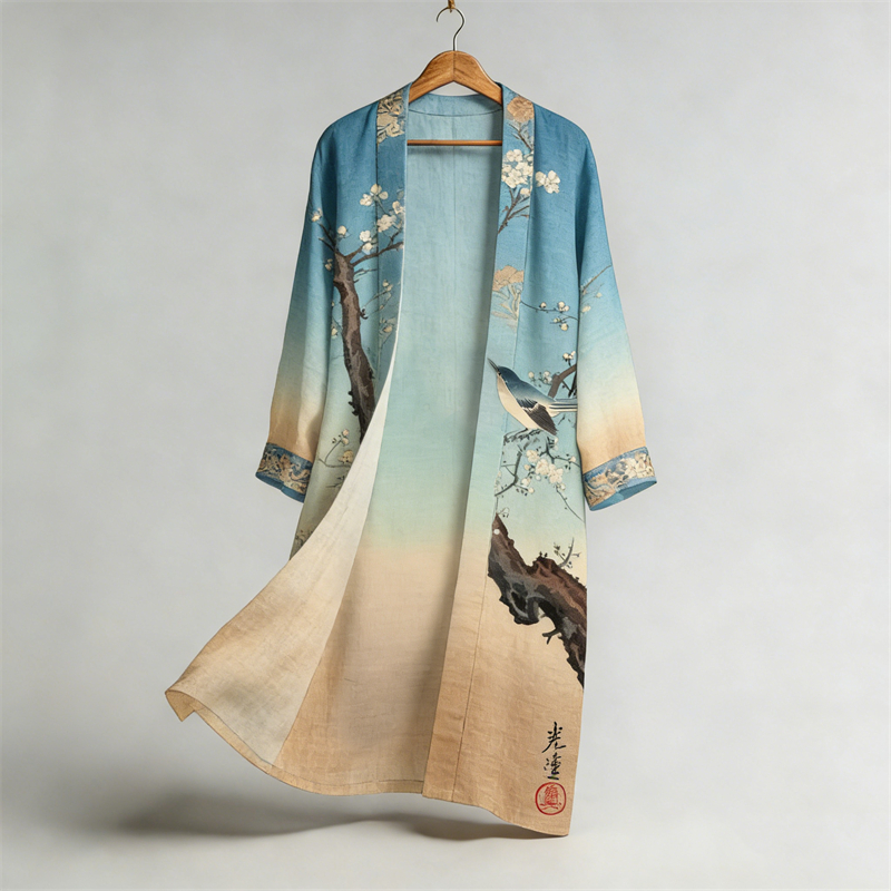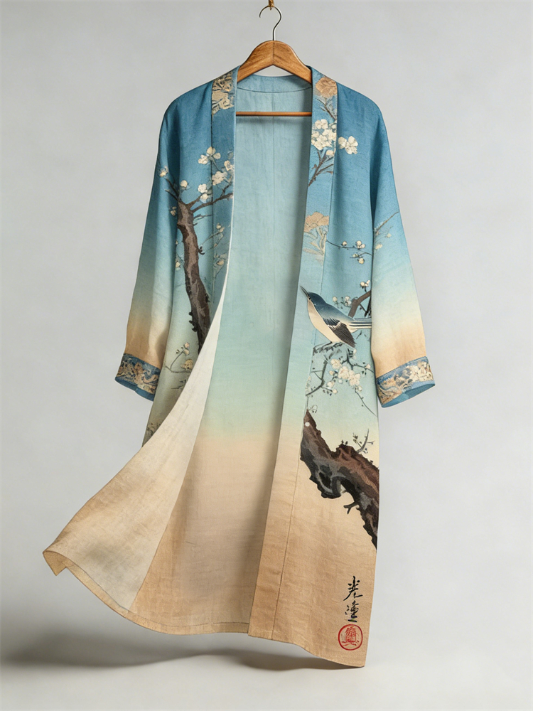 Japanese Bird Plum Blossom Gradient Flowy Long Linen Kimono