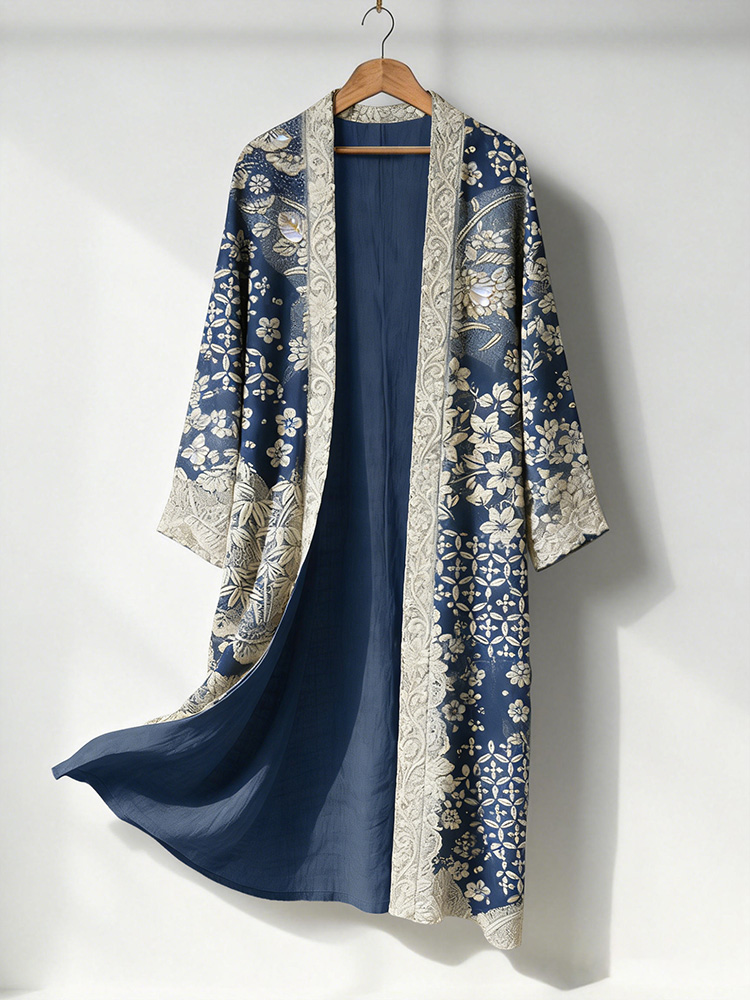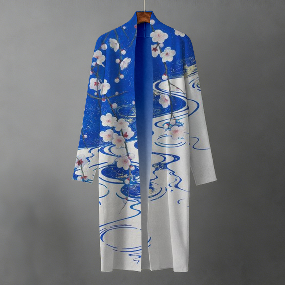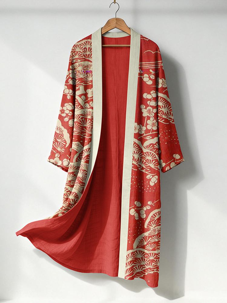 Japanese Art Retro Plants And Flowers Printed Long Cardigan