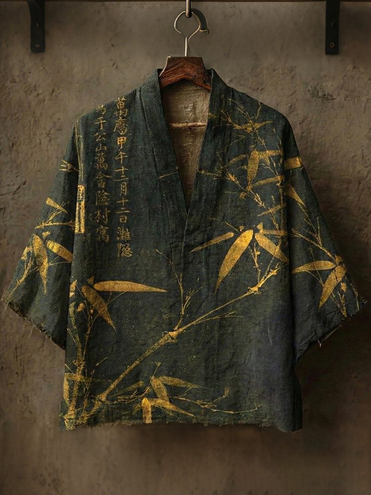 Men's Retro Bamboo Calligraphy Art Print Linen Kimono