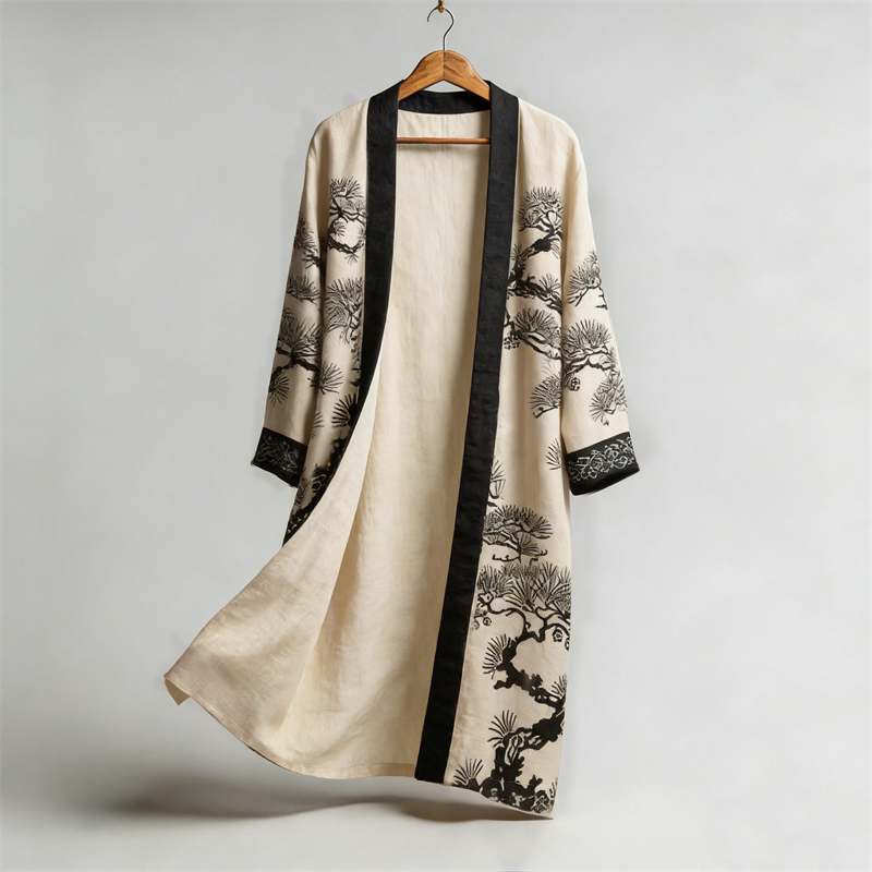 Japanese Pine Trees Lino Art Flowy Long Linen Kimono