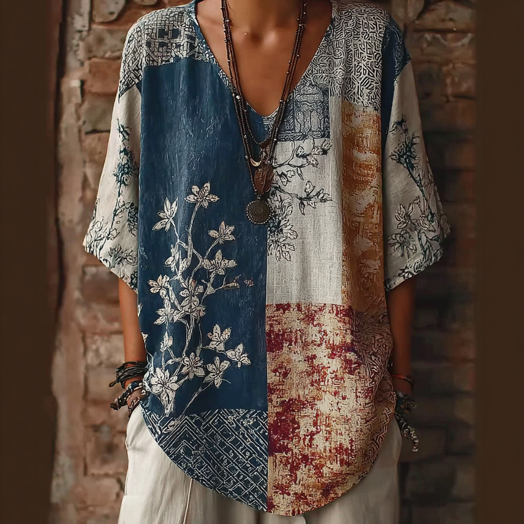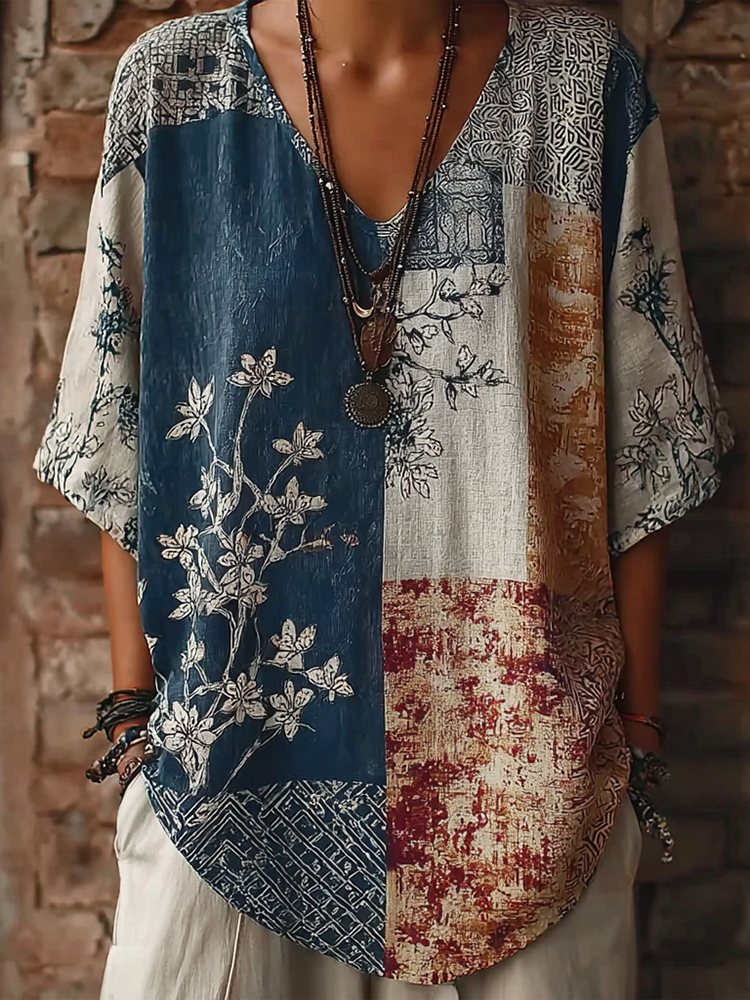 Japanese Art Retro Geometric Patchwork Plant Flower Print Women's V-neck Cotton And Linen Top