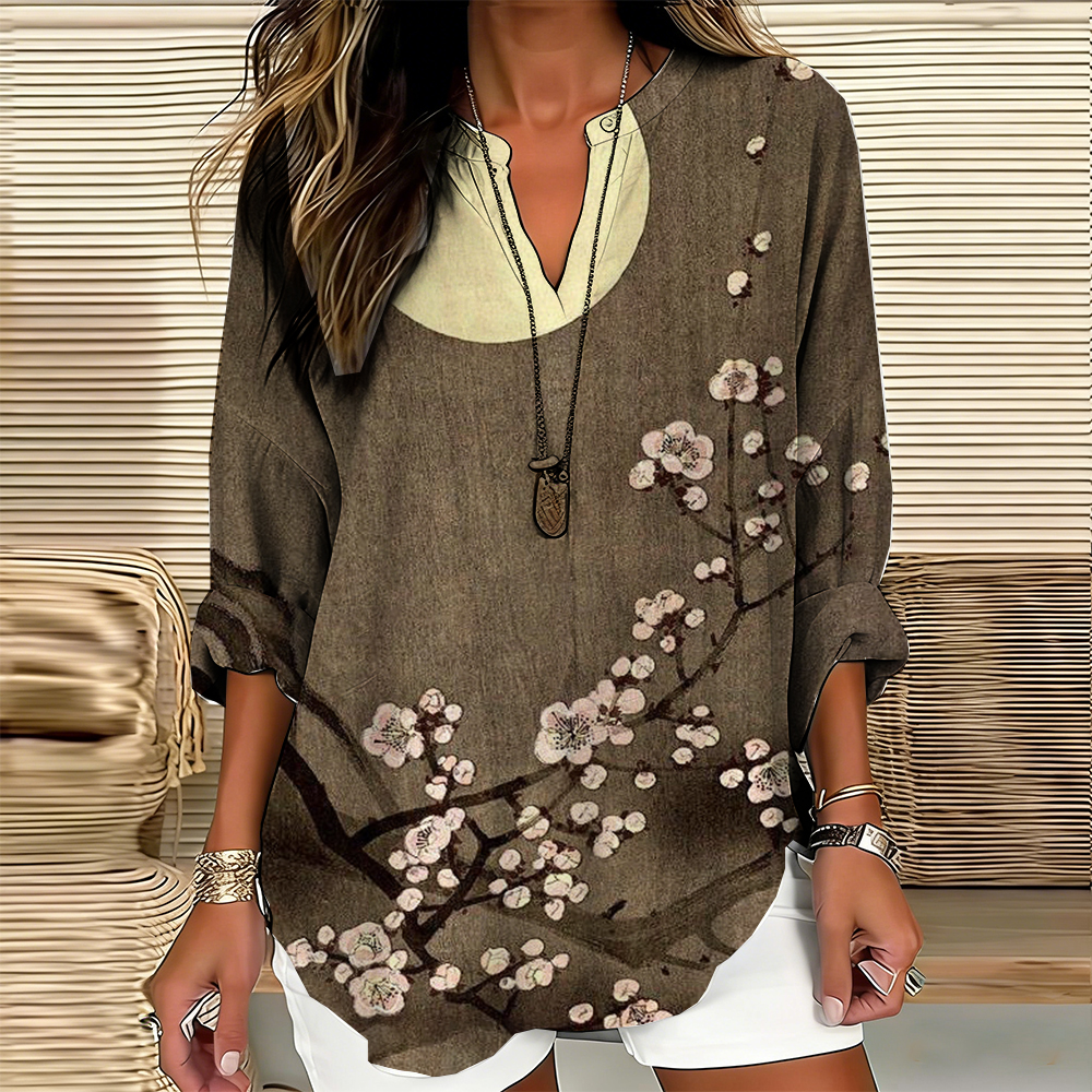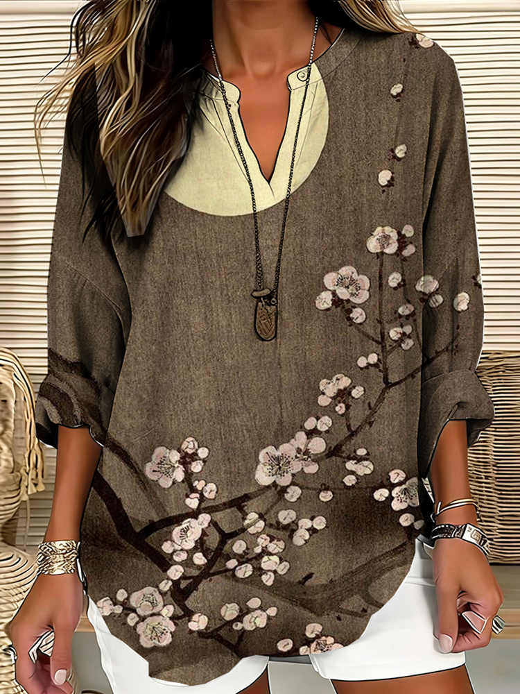 Japanese Style Moonlit Plum Leisure V-neck Cotton And Linen Top