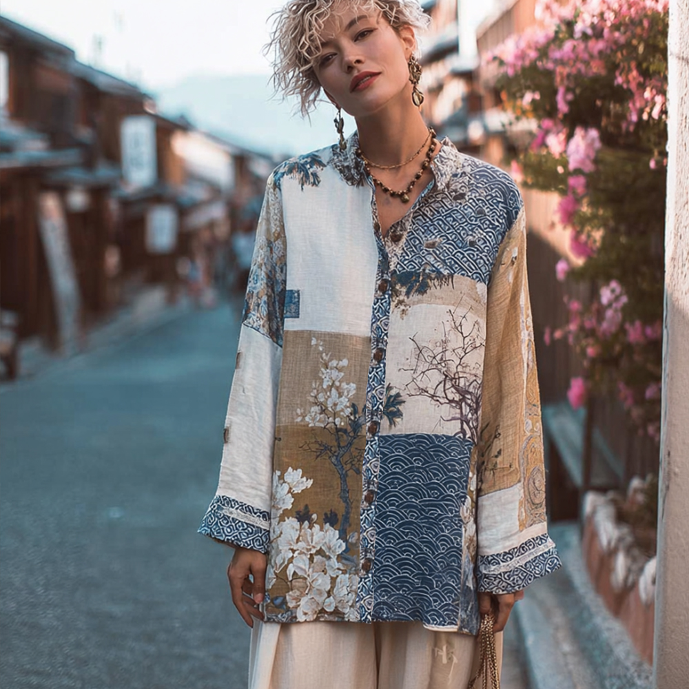 Women's Japanese Traditional Embroidery Floral Patchwork Art Printed Linen Long Sleeve Shirt