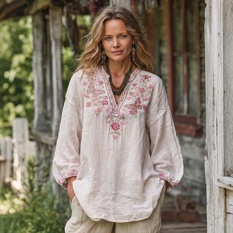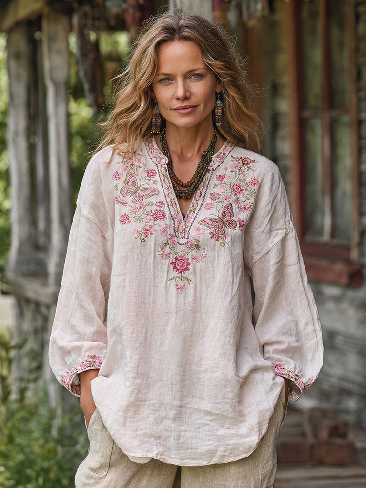 Boho Butterfly Orchid Floral Embroidery Women's Linen Shirt