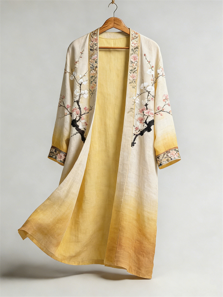 Japanese Cherry Blossom Boho Gradient Flowy Long Linen Kimono