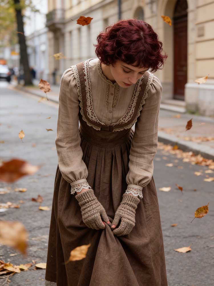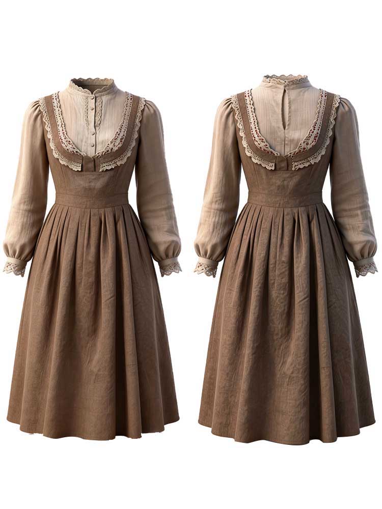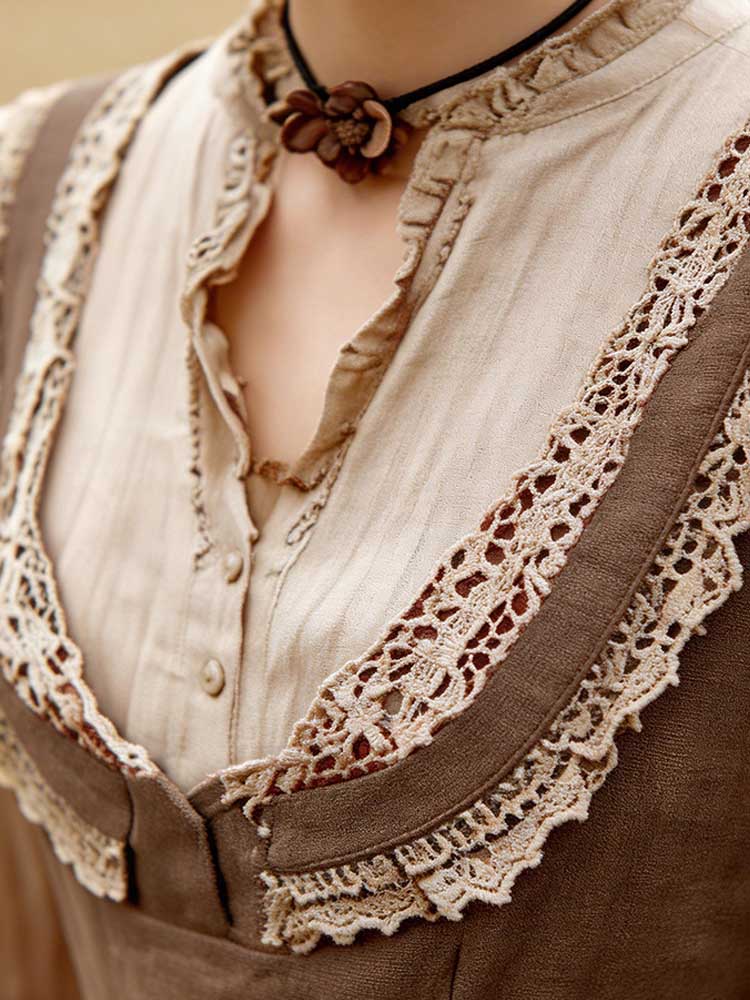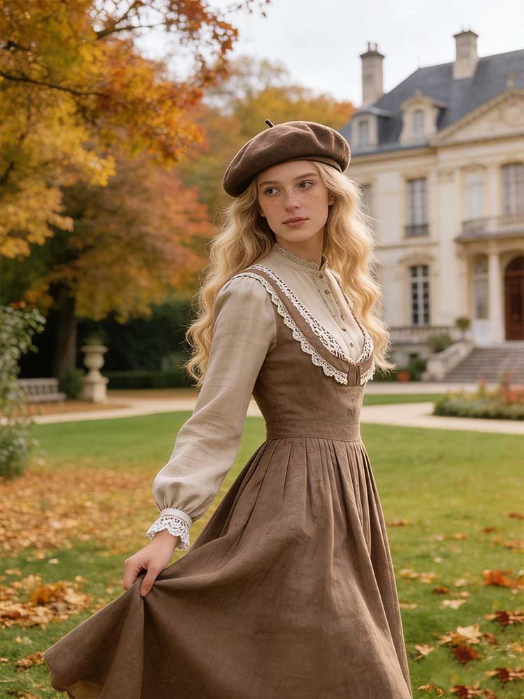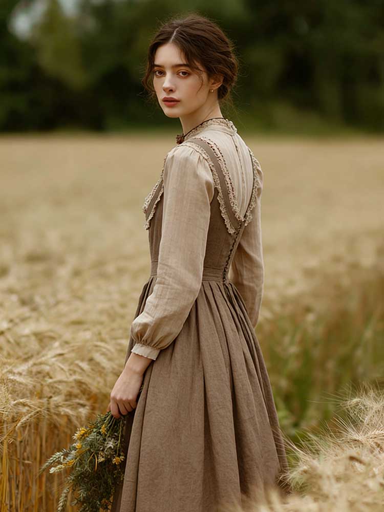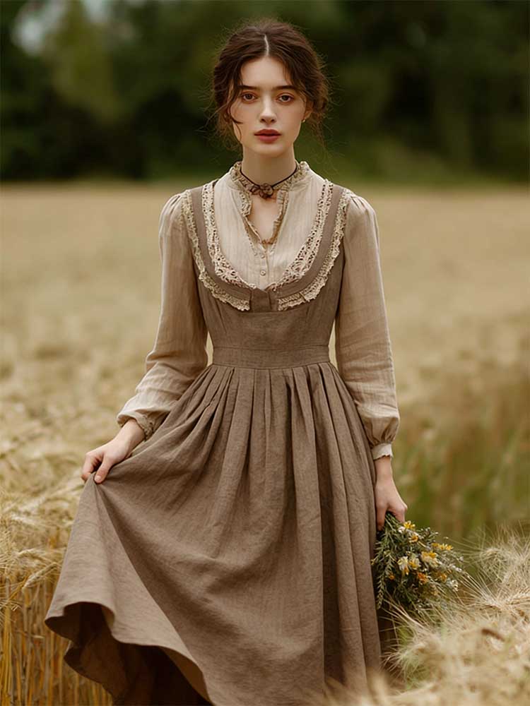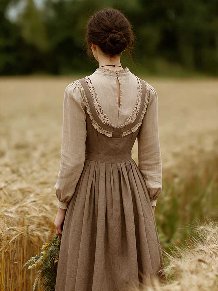 Retro Linen Lace Patchwork French Countryside Style Waist-cinching Dress