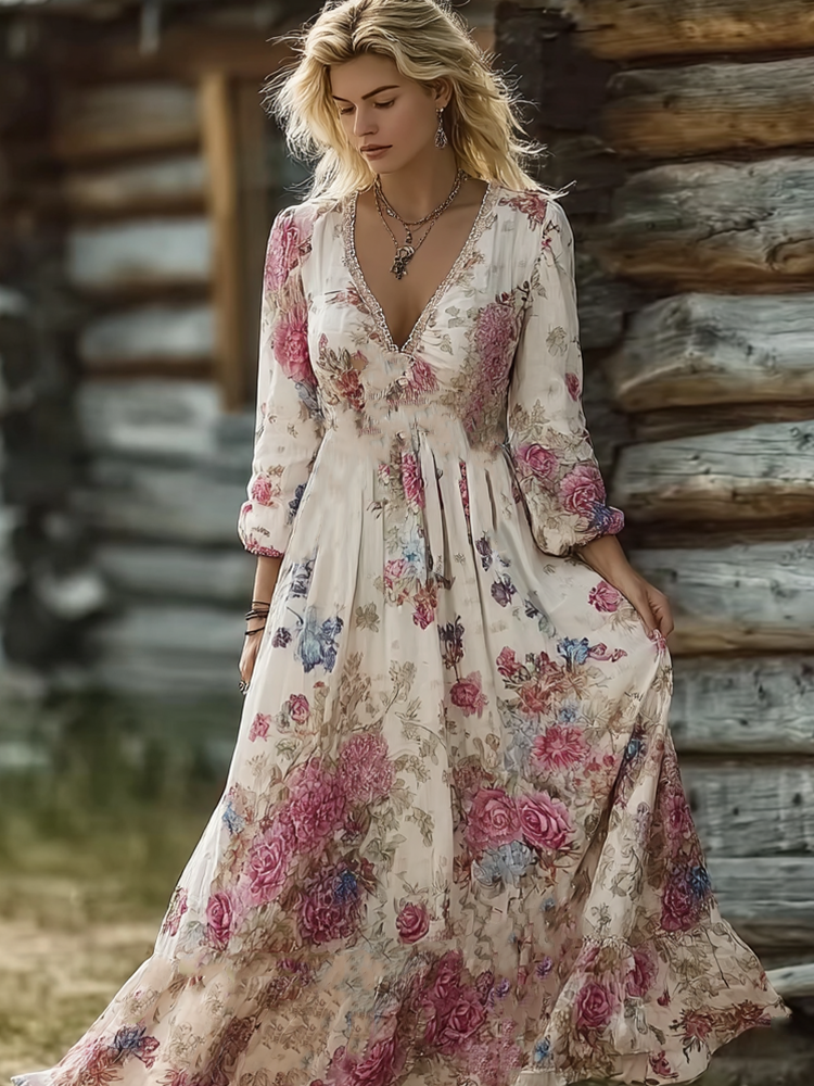Bohemian Style Floral Butterfly Pattern Women's V-neck Dress