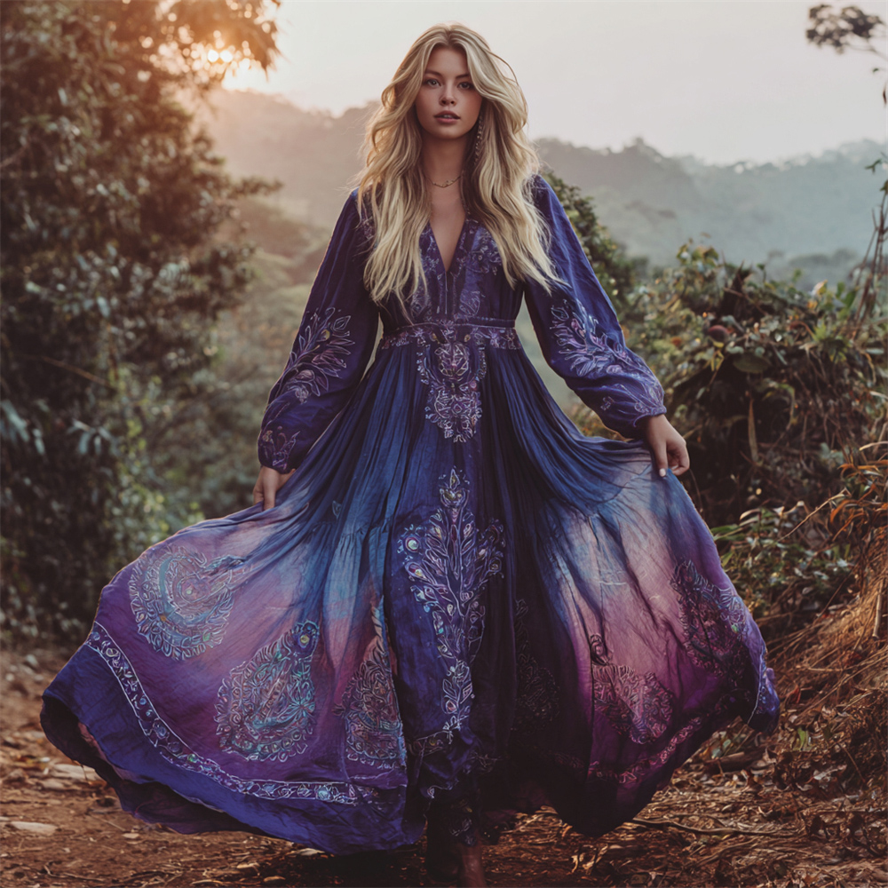 Boho Vintage Ethnic Floral Art Women's Linen V-neck Flowy Maxi Dress