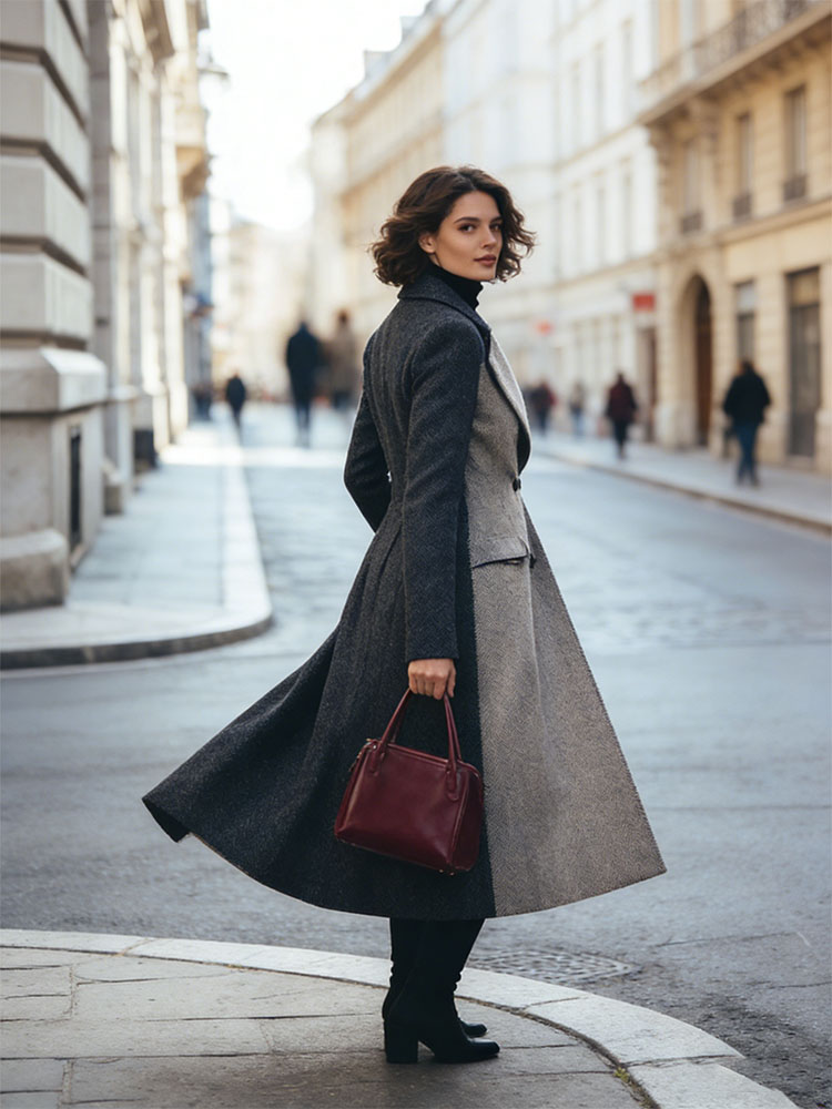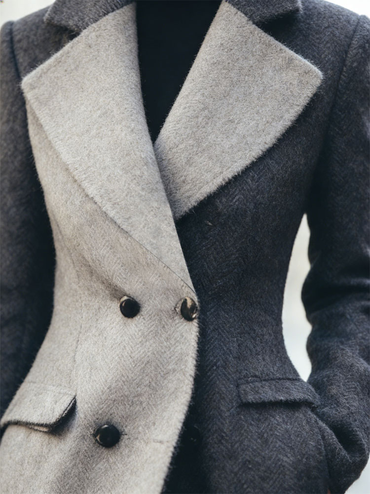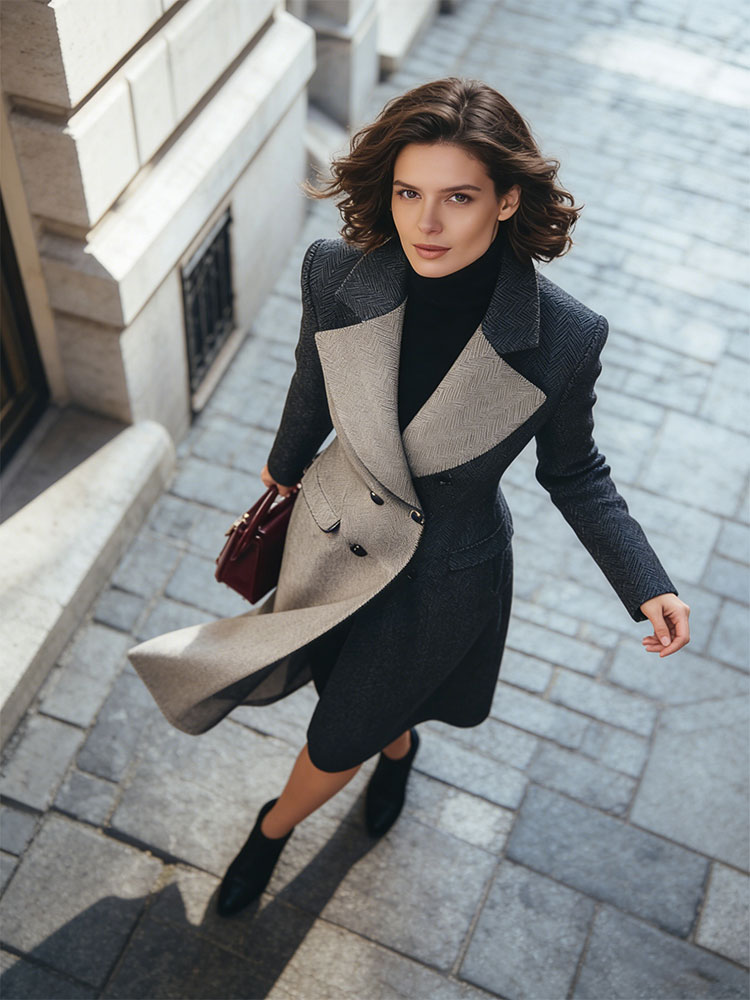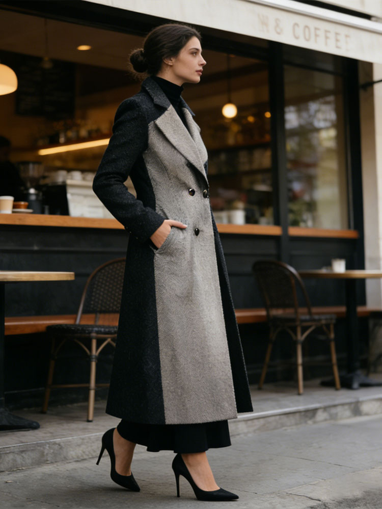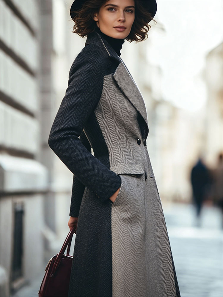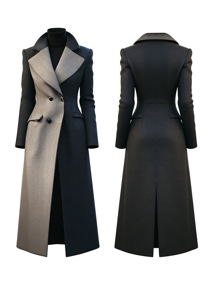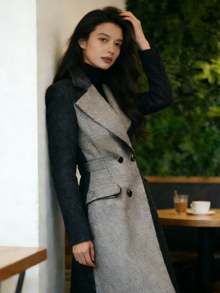Classy Contrast Color Double Breasted Long Wool Coat