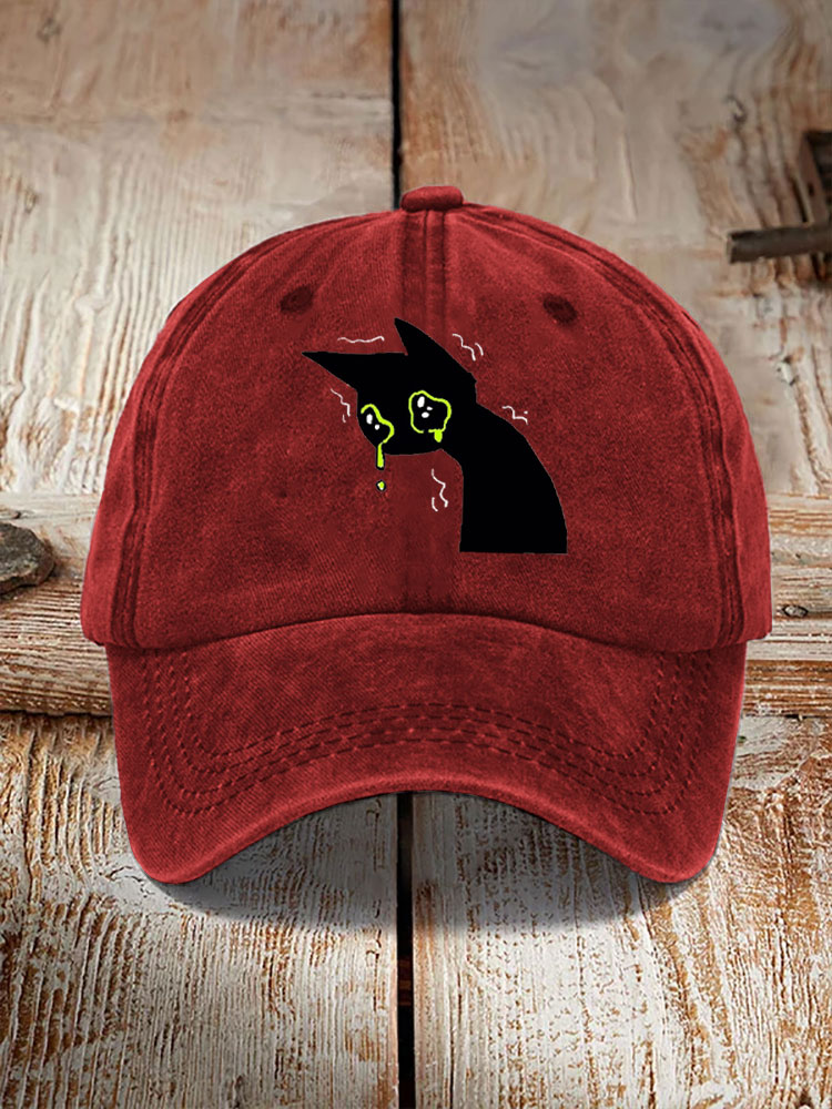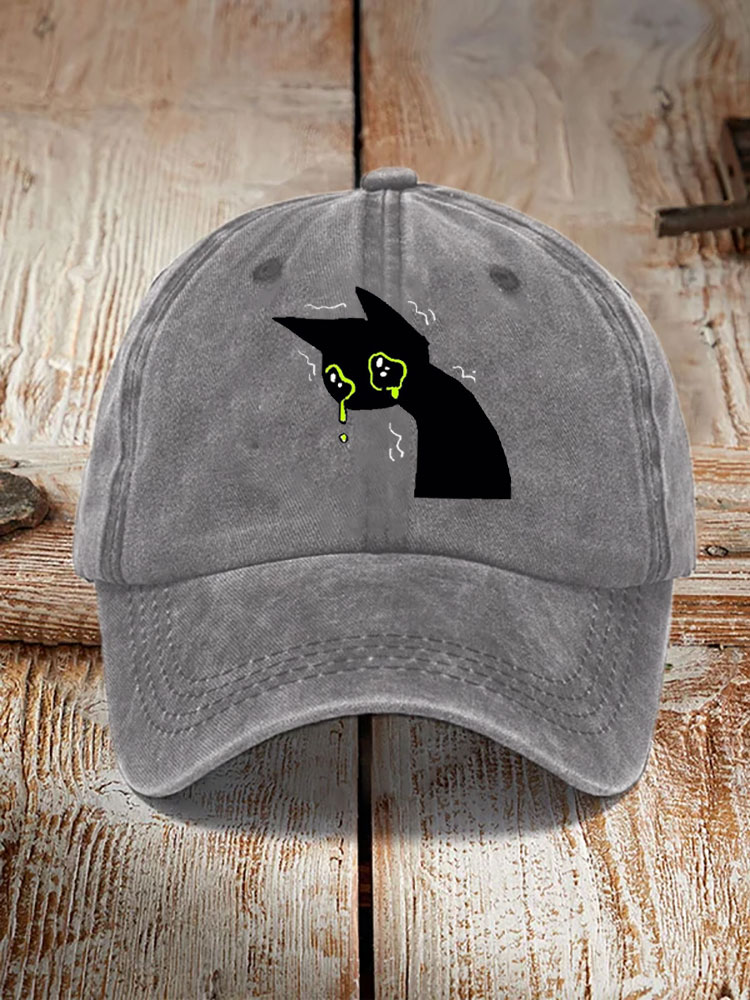 Japanese Art Black Cat Print Washed Hat