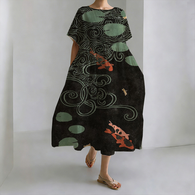 Japanese Carp And Pond Art Linen And Cotton Round Neck Dress