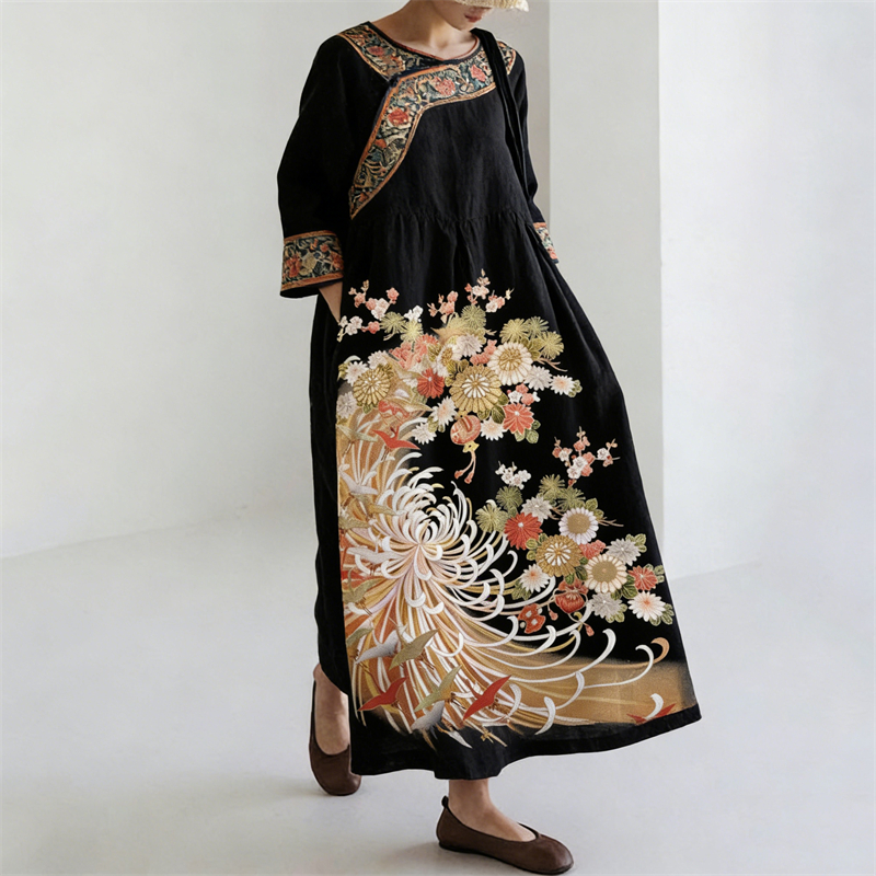 Japanese Chrysanthemum Floral Art Ethnic Linen Maxi Dress