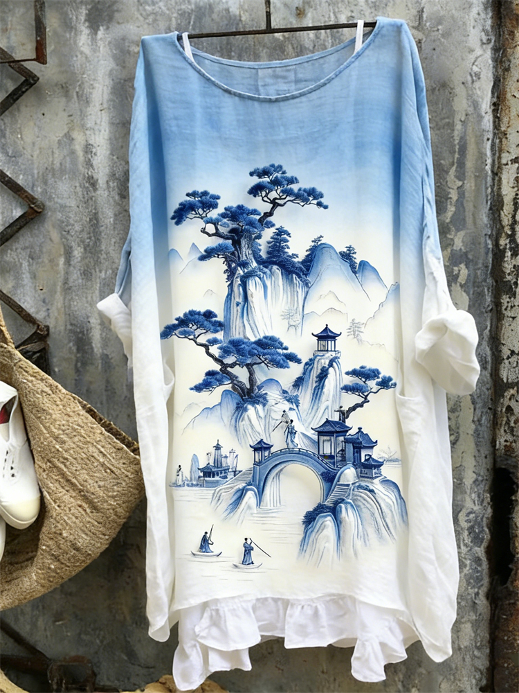 Mountains Landscape Japanese Art Gradient Flowy Linen Tunic