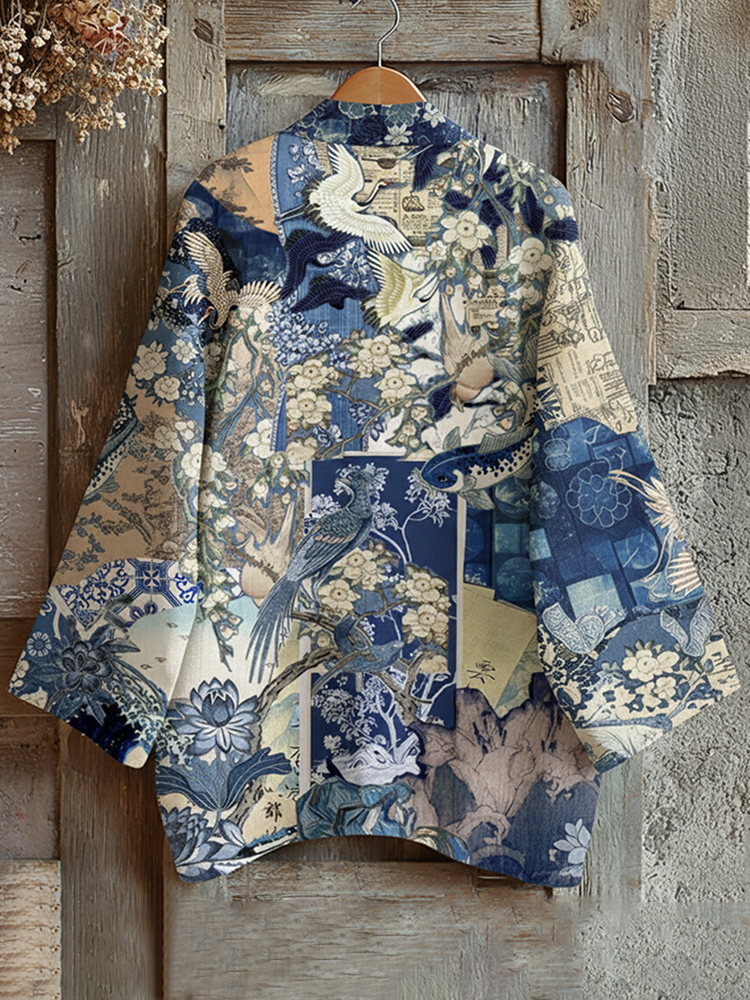 Retro Japanese Traditional Sashiko With Crane Art Print Cotton And Linen Blend Kimono Cardigan