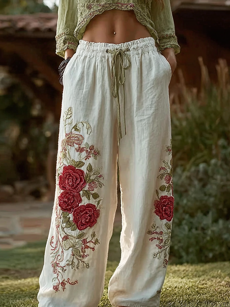 Retro Red Rose Pattern Casual Cotton And Linen Long Pants