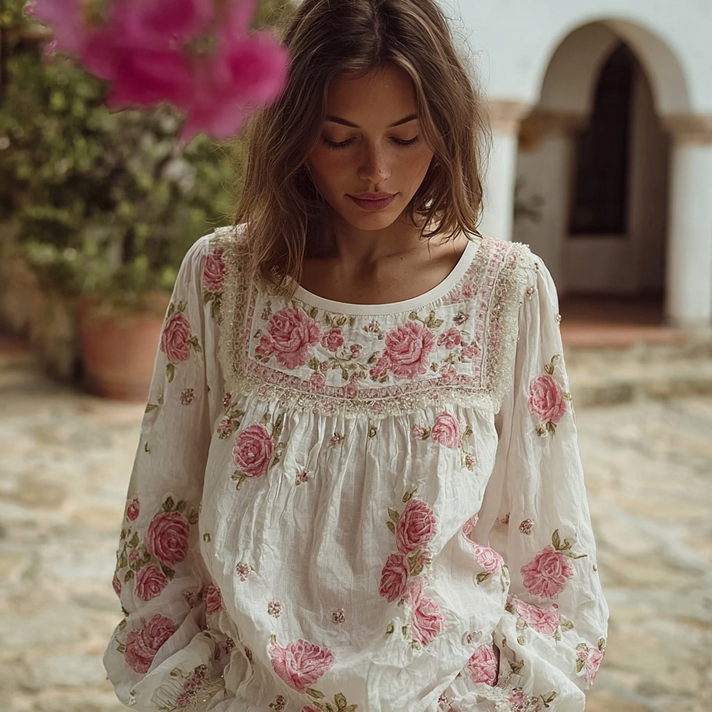Vintage Boho Roses Pattern Comfy Linen Tunic
