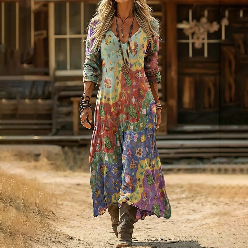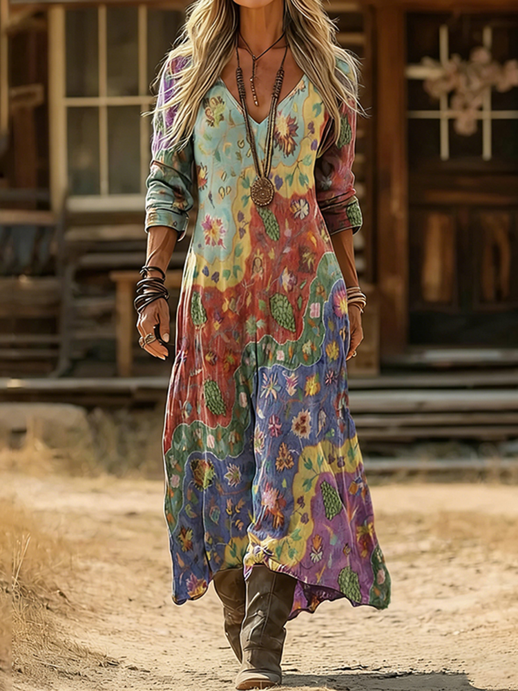 Vintage Ethnic Floral Art Pattern Linen Blend V-neck Loose Long Sleeve Midi Dress