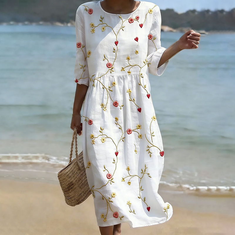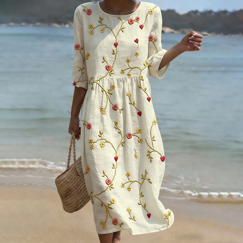 Vintage Floral Art Pattern Linen Blend Loose Three-quarter Sleeve Dress