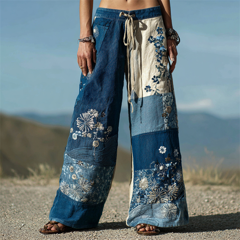 Vintage Japanese Floral Embroidered Patchwork Flowy Linen Pants