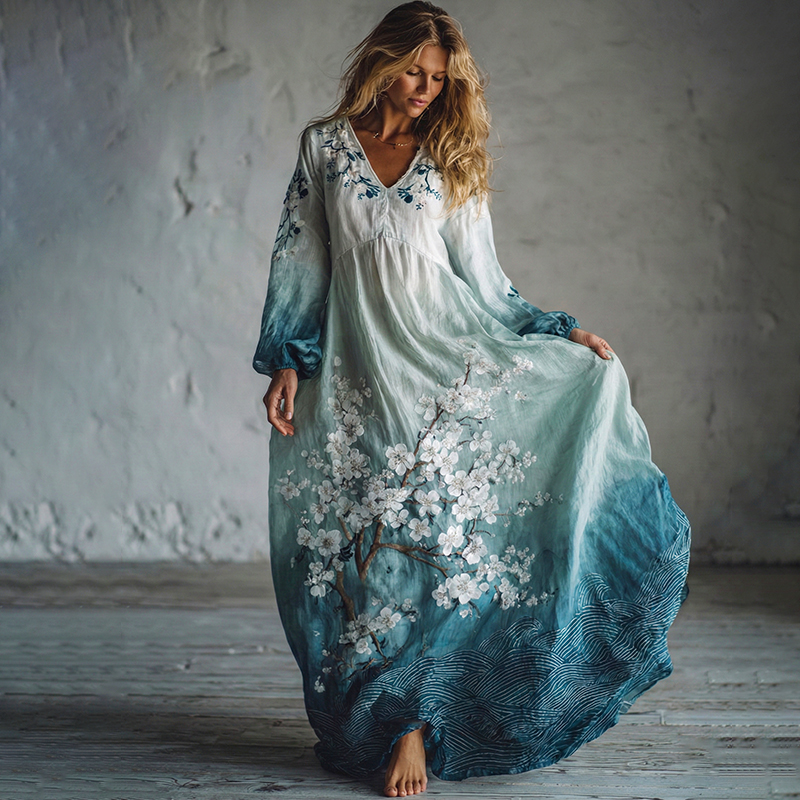 Vintage Japanese Plum Blossom Ukiyo Print Linen Blend Dress